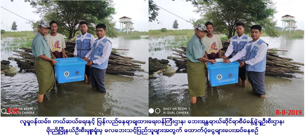 လူမှုဝန်ထမ်း၊ ကယ်ဆယ်ရေးနှင့် ပြန်လည်နေရာချထားရေးဝန်ကြီးဌာန၊ ဘေးအန္တရာယ်ဆိုင်ရာစီမံခန့်ခွဲမှုဦးစီးဌာန၊ မိုးညို မြို့နယ်ဦးစီးမှူးရုံးမှ တာဝန်ရှိသူများသည် မိုးညိုမြို့နယ်၊ ဘုရားငူကျေးရွာအုပ်စု၊ ဘုရားငူကျေးရွာတွင် (၆.၈.၂၀၁၉)ရက်နေ့၊ နံနက်(၁း၀၀)နာရီအချိန်က ဖြစ်ပွားခဲ့သော လေဘေးမှ ပြိုလဲနေအိမ်(၁)လုံးအတွက် အိမ်ဆောက်ပစ္စည်းဖိုးထောက်ပံ့ငွေ(၁၀၀၀၀၀/-)ကျပ်နှင့် ပြိုလဲနေအိမ် မှဘေးသင့် ပြည်သူ စုစုပေါင်း(၅)ဦးအတွက် ဆန်ရိက္ခာ ဖိုးထောက်ပံ့ငွေ (၁၀,၅၀၀) ကျပ်၊ စုစုပေါင်း (၁၁၀,၅၀ဝ/-) ကျပ်တို့ကို (၈-၈-၂၀၁၉)ရက်နေ့ နေ့လည် (၁၂:၃၀)နာရီအချိန်တွင် တာဝန်ရှိသူများနှင့်အတူ သက်ဆိုင်ရာကျေးရွာအုပ်စုအုပ်ချုပ်ရေးမှူးနှင့် ဘေးသင့်ပြည်သူများလက်ဝယ် ထောက်ပံ့ပေးအပ်ခဲ့ပါကြောင်း သတင်းရရှိပါသည်။