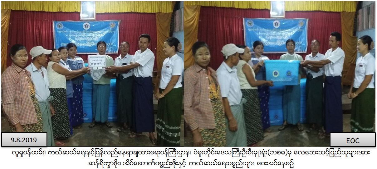လူမှုဝန်ထမ်း၊ ကယ်ဆယ်ရေးနှင့်ပြန်လည်နေရာချထားရေးဝန်ကြီးဌာန၊ ဘေးအန္တရာယ်ဆိုင်ရာစီမံခန့်ခွဲမှုဦးစီးဌာန၊ ပဲခူးတိုင်းဒေသကြီးဦးစီးမှူးရုံးမှ (၇/၈-၈-၂၀၁၉) ရက်နေ့ ပဲခူးတိုင်းဒေသကြီး၊ ပဲခူးခရိုင်၊ ကဝမြို့နယ်၊ အောင်ကောင်းညွန့်ကျေးရွာ၊ ငွေတောင်ကျေးရွာအုပ်စု၊ ဗိုလ်တဲကျေးရွာနှင့် ချမ်းသာကြီးကျေးရွာတို့တွင် ဖြစ်ပွားခဲ့သောလေဘေးမှ ပြိုလဲနေအိမ် (၁၃)လုံးအတွက် အိမ်ဆောက်ပစ္စည်းဖိုးထောက်ပံ့ငွေ(၁၃၀၀၀၀၀ိ/-)ကျပ်၊ ပြိုလဲနေအိမ်(၁၃)လုံးနှင့် အမိုးလန်နေအိမ်(၃၆)လုံးရှိ လူဦးရေ (၂၅၈)ဦးအတွက် ဆန်ရိက္ခာဖိုးထောက်ပံ့ငွေ(၅၄၁၈၀၀ိ/-)ကျပ်၊ စုစုပေါင်းထောက်ပံ့ငွေ(၁၈၄၁၈၀၀ိ/-)ကျပ်နှင့် ထောက်ပံ့ရေးပစ္စည်း(၁၅)မျိုး(ပလပ်စတစ်ပုံးအပါ)(၁၃)အိမ်ထောင်စာအား ပဲခူးတိုင်းဒေသကြီးဦးစီးမှူးရုံးနှင့် ကဝမြို့နယ်ဦးစီးမှူးရုံးဝန်ထမ်းများမှ (၉.၈.၂၀၁၉)ရက်နေ့တွင် သွားရောက်ထောက်ပံ့ခဲ့ကြောင်း သတင်းရရှိပါသည်။