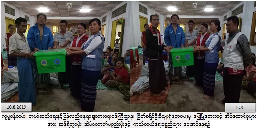 လူမှုဝန်ထမ်း၊ ကယ်ဆယ်ရေးနှင့်ပြန်လည်နေရာချထားရေးဝန်ကြီးဌာန၊ ဘေးအန္တရာယ်ဆိုင်ရာစီမံခန့်ခွဲမှုဦးစီးဌာန၊ မြိတ်ခရိုင်ဦးစီးမှူးရုံးမှ (၁၀.၈.၂၀၁၉)ရက်နေ့ မြိတ်မြို့နယ်၊ ပြင်းငယ်ကျေးရွာအုပ်စု၊ ပြင်းငယ်ကျေးရွာတွင်ဖြစ်ပွားခဲ့သော မြေပြိုဘေးမှ ပြိုကျပျက်စီးခဲ့သော တိုက်အိမ်(၂)လုံး၊ သွပ်မိုးပျဉ်ထောင်အိမ်(၁)လုံးအတွက် အိမ်ဆောက်ပစ္စည်းဖိုး (၆၀၀၀၀ဝိ/-)ကျပ်၊ ဓနိမိုးပျဉ်ခင်းအိမ်(၃)လုံးအတွက် အိမ်ဆောက်ပစ္စည်းဖိုး(၃၀၀၀၀ဝိ/-)ကျပ်၊ ကယ်ဆယ်ရေးပစ္စည်း(၁၅) မျိုး (၆)စုစာ၊ ဘုန်းတော်ကြီးကျောင်းသို့ပြောင်းရွှေ့နေထိုင်သူ လူဦးရေစုစုပေါင်း(၁၂၃)ဦးအတွက် ဆန်ရိက္ခာဖိုး (၂၅၈၃၀၀ိ/-)ကျပ် တို့အား (၁၁.၈.၂၀၁၉)နေ့တွင် ကြက်ခြေနီတပ်ဖွဲ့နှင့်ပူးပေါင်း၍ သွားရောက်ထောက်ပံ့ပေးခဲ့ကြောင်း သတင်းရရှိပါသည်။