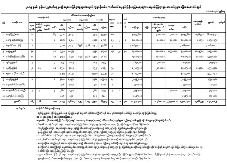 ၂၀၁၉ ခုနှစ်၊ ဇွန်လ (၂၅) ရက်နေ့မှစ၍ ရေဘေးဖြစ်ပွားမှုများအတွက် လူမှုဝန်ထမ်း၊ ကယ်ဆယ်ရေးနှင့် ပြန်လည်နေရာချထားရေးဝန်ကြီးဌာနမှ ထောက်ပံ့မှုအခြေအနေစာရင်းချုပ်