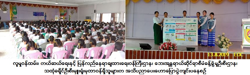 လူမှုဝန်ထမ်း၊ ကယ်ဆယ်ရေးနှင့် ပြန်လည်နေရာချထားရေးဝန်ကြီးဌာန၊ ဘေးအန္တရာယ်ဆိုင်ရာစီမံခန့်ခွဲမှုဦးစီး ဌာန၊ သထုံခရိုင်ဦးစီးမှူးရုံးမှတာဝန်ရှိသူများသည် (၁၃-၈-၂၀၁၉) ရက်နေ့၊ (၁ဝး၀၀)နာရီမှ (၁၂းဝဝ) နာရီအထိ မွန်ပြည်နယ်၊ ပေါင်မြို့နယ်၊ အခြေခံပညာအထက်တန်းကျောင်း (အ.ထ.က-ဇင်းကျိုက်)၊ ရတနာမွန်ခန်းမ၌ သဘာဝဘေးလျော့ပါးရေးအသိပညာပေးဟောပြောပွဲကျင်းပပြုလုပ်ခဲ့ရာ ကျောင်းသား/သူ (၄၀၀) ဦး တက်ရောက်ခဲ့ပြီး တက်ရောက်လာသူများအား လက်ကမ်းစာစောင်များဖြန့်ဝေခဲ့ပါကြောင်းသတင်းရရှိပါသည်။