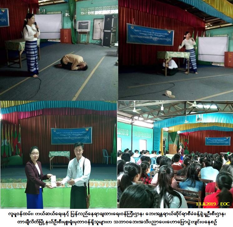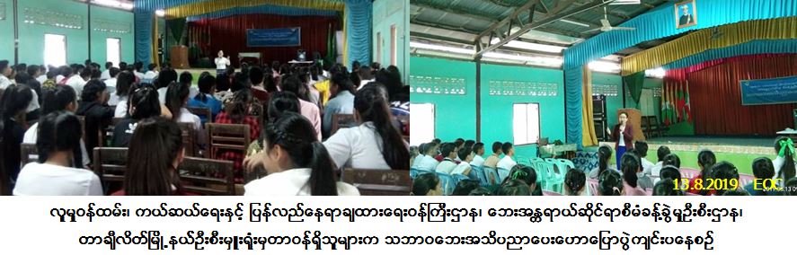 လူမှုဝန်ထမ်း၊ ကယ်ဆယ်ရေးနှင့် ပြန်လည်နေရာချထားရေးဝန်ကြီးဌာန၊ ဘေးအန္တရာယ်ဆိုင်ရာစီမံခန့်ခွဲမှုဦးစီး ဌာန၊ တာချီလိတ်မြို့နယ်ဦးစီးမှူးရုံးမှတာဝန်ရှိသူများသည် (၁၃-၈-၂၀၁၉)ရက်နေ့၊ နံနက်(၀၉း၀၀)မှ (၁၁း၀၀)အချိန်ထိ တာချီလိတ်မြို့၊ မကာဟိုခမ်းရပ်ကွက်၊ အခြေခံပညာအထက်တန်းကျောင်း၌ သဘာဝဘေး အသိပညာပေးဟောပြောပွဲကျင်းပပြုလုပ်ခဲ့ရာ ကျောင်းသား/ကျောင်းသူစုစုပေါင်း (၁၅၀) ဦးတက်ရောက်ခဲ့ပါ သည်။ အဆိုပါဟောပြောပွဲ၌ ရာသီဥတုပြောင်းလဲခြင်းနှင့် စပ်လျဉ်း၍ ဖြစ်ပွားတတ်သော ဘေးအန္တရာယ်များ၊ ဘေးအန္တရာယ်မဖြစ်ပွားမီ/ ဖြစ်ပွားနေစဉ်/ ဖြစ်ပွားပြီးနောက် ဆောင်ရန်/ရှောင်ရန်အချက်များ ဆွေးနွေးဟောပြောခြင်း၊ ငလျင်လှုပ်ခတ်နေစဉ်နေထိုင်ရမည့် အနေအထားကို လက်တွေ့သရုပ်ပြသခြင်း၊ ဘေးအမျိုးအစားအလိုက် တုန့်ပြန်ဆောင်ရွက်ရမည့် အနေအထားများကို ဂိမ်းများကစားခြင်းဖြင့် ရှင်းလင်းဟောပြောခဲ့ခြင်းတို့ ဆောင်ရွက်ခဲ့ပြီး တက်ရောက်လာသူများအား လက်ကမ်းစာစောင်များဖြန့်ဝေခဲ့ပါ ကြာင်း သတင်းရရှိပါသည်။