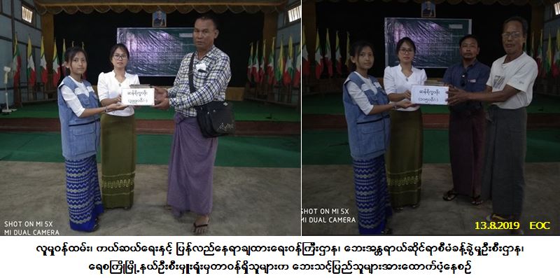 လူမှုဝန်ထမ်း၊ ကယ်ဆယ်ရေးနှင့် ပြန်လည်နေရာချထားရေးဝန်ကြီးဌာန၊ ဘေးအန္တရာယ်ဆိုင်ရာစီမံခန့်ခွဲမှုဦးစီး ဌာန၊ ရေစကြိုမြို့နယ်ဦးစီးမှူးရုံးမှတာဝန်ရှိသူများသည် မကွေးတိုင်းဒေသကြီး၊ ပခုက္ကူခရိုင်၊ ရေစကြိုမြို့နယ်၊ ပခန်းငယ်ကျေးရွာအုပ်စု၊ ပခန်းငယ်ကျေးရွာ၌ (၁၂-၈-၂၀၁၉) ရက်နေ့၊ (၁၈း၄၀)အချိန်တွင် ဖြစ်ပွားခဲ့သောလေပြင်းတိုက်ခတ်မှုကြောင့် သွပ်အမိုး(၁၅)ချပ်လန်နေအိမ်(၁) လုံး၊ အိမ်ထောင်စု (၁) စုမှ လူဦးရေ (၅)ဦးတို့အတွက် ဆန်ရိက္ခာဖိုးထောက်ပံ့ငွေ (၁၀,၅၀၀/-) ကျပ်၊ အိမ်ဆောက်ပစ္စည်းဖိုးထောက်ပံ့ငွေ (၅၀,၀၀၀/-) ကျပ်ကိုလည်းကောင်း၊ ရေစကြိုမြို့နယ်၊ ကွေ့ထောင့်ကျေးရွာအုပ်စု၊ ကွေ့ထောင့်ကျေးရွာ၌ (၁၃-၈-၂၀၁၉) ရက်နေ့၊ (၁၁း၀၀)အချိန်တွင်ဖြစ်ပွားခဲ့သော ဧရာဝတီမြစ်ရေတိုက်စား၍ ကမ်းပါးပြိုကျမှုကြောင့် ကြိုတင်ဖျက်သိမ်းပြောင်းရွှေ့နေအိမ် (၅) လုံး၊ အိမ်ထောင်စု (၆) စုမှလူဦးရေ (၁၉) ဦးတို့အတွက် ဆန်ရိက္ခာ(၇) ရက်စာဖိုးထောက်ပံ့ငွေ (၃၉,၉၀၀/-) ကျပ်၊ အိမ်ဆောက်ပစ္စည်းဖိုးထောက်ပံ့ငွေ (၅၀၀,၀၀၀/-) ကျပ် တို့ကိုလည်းကောင်း (၁၃-၈-၂၀၁၉) ရက်နေ့တွင် ကျေးရွာအုပ်ချုပ်ရေးမှူးနှင့်အတူ ဘေးသင့်ပြည်သူများလက်ဝယ်အရောက် ထောက်ပံ့ပေးအပ်ခဲ့ပါကြောင်း သတင်းရရှိပါသည်။