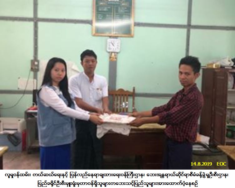 လူမှုဝန်ထမ်း၊ ကယ်ဆယ်ရေးနှင့် ပြန်လည်နေရာချထားရေးဝန်ကြီးဌာန၊ ဘေးအန္တရာယ်ဆိုင်ရာစီမံခန့်ခွဲမှုဦးစီး ဌာန၊ ပြည်ခရိုင်ဦးစီးမှူးရုံးမှတာဝန်ရှိသူများသည် ပြည်ခရိုင်၊ ရွှေတောင်မြို့နယ်၊ ရှားပင်ကုန်းကျေးရွာအုပ်စု၊ ဆင်ကျွန်းကျေးရွာ၌ (၇-၈-၂၀၁၉) ရက်နေ့တွင် ဖြစ်ပွားခဲ့သော ကမ်းပြိုဘေးကြောင့် ကြိုတင်ရွေ့ပြောင်းနေအိမ် (၄) လုံးအတွက် အိမ်ဆောက်ပစ္စည်းဖိုးထောက်ပံ့ငွေ (၄၀၀,၀၀၀/-) ကျပ်ကို (၁၄-၈-၂၀၁၉) ရက်နေ့ (၁၁:၀၀)နာရီအချိန်တွင် ဘေးသင့်ပြည်သူများ လက်ဝယ်အရောက် ထောက်ပံ့ပေးအပ်ခဲ့ပါကြောင်း သတင်း ရရှိပါသည်။