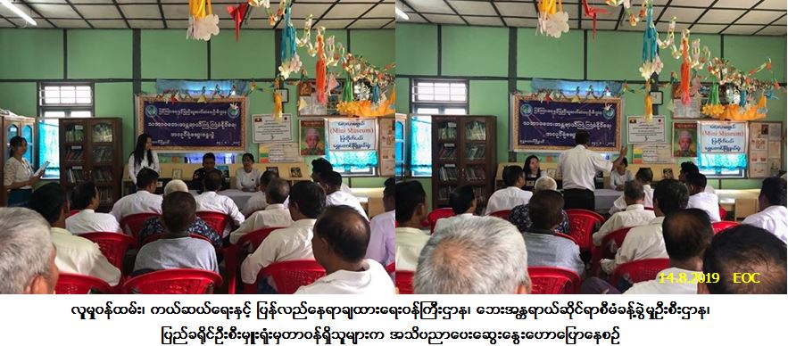 လူမှုဝန်ထမ်း၊ ကယ်ဆယ်ရေးနှင့် ပြန်လည်နေရာချထားရေးဝန်ကြီးဌာန၊ ဘေးအန္တရာယ်ဆိုင်ရာစီမံခန့်ခွဲမှုဦးစီး ဌာန၊ ပြည်ခရိုင်ဦးစီးမှူးရုံးမှတာဝန်ရှိသူများသည် (၁၄-၈-၂၀၁၉) ရက်နေ့၊ နံနက်(၉:၀၀)အချိန်တွင် ရွှေတောင်မြို့နယ်၌ ပြန်ကြားရေးနှင့်ပြည်သူ့ဆက်ဆံရေးဦးစီးဌာနမှကျင်းပပြုလုပ်သော သဘာဝဘေးအန္တရာယ်ကြံ့ကြံ့ခံနိုင်ရေးအလုပ်ရုံဆွေးနွေးပွဲတွင် ရပ်ကွက်အုပ်ချုပ်ရေးမှူးများနှင့် ရပ်မိ/ရပ်ဖများ၊ စုစုပေါင်း (၄၀) ဦးခန့်ကို သဘာဝဘေးလျော့ပါးရေးအသိပညာပေးဆွေးနွေးဟောပြောခဲ့ပါကြောင်းသတင်းရရှိပါသည်။