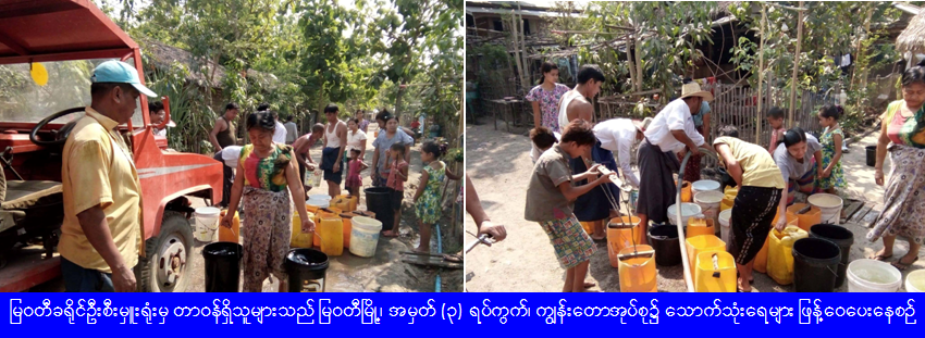 ကယ်ဆယ်ရေးနှင့် ပြန်လည်နေရာချထားရေးဦးစီးဌာန၊ မြဝတီခရိုင်ဦးစီးမှူးရုံးမှ တာဝန်ရှိသူများသည် (၁၁-၅-၂၀၁၆) ရက်နေ့တွင် မြဝတီမြို့၊ အမှတ် (၃) ရပ်ကွက်၊ ကျွန်းတောအုပ်စုအတွင်းရှိ ပြည်သူများအတွက် သောက်သုံးရေဂါလန် (၂၀၀၀) ကို သွားရောက်ဖြန့်ဝေပေးခဲ့ကြောင်း သိရှိရပါသည်။