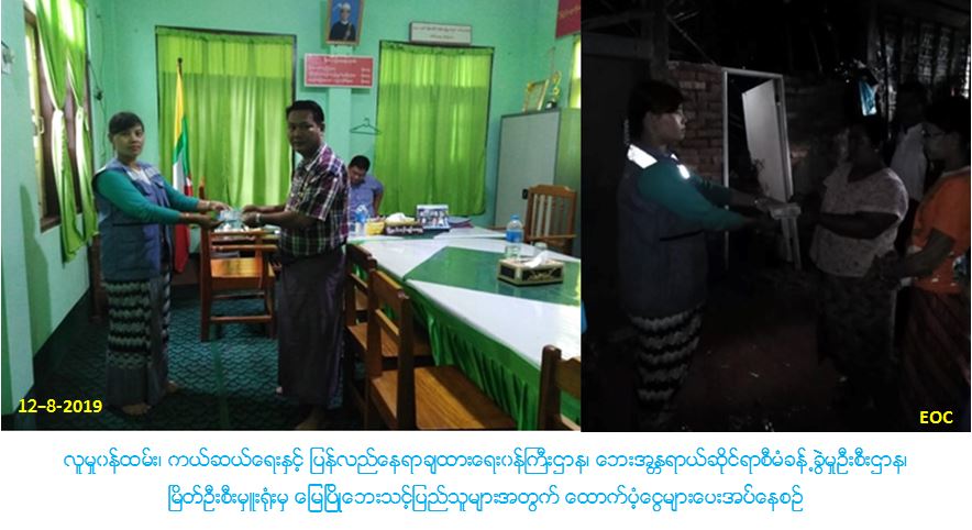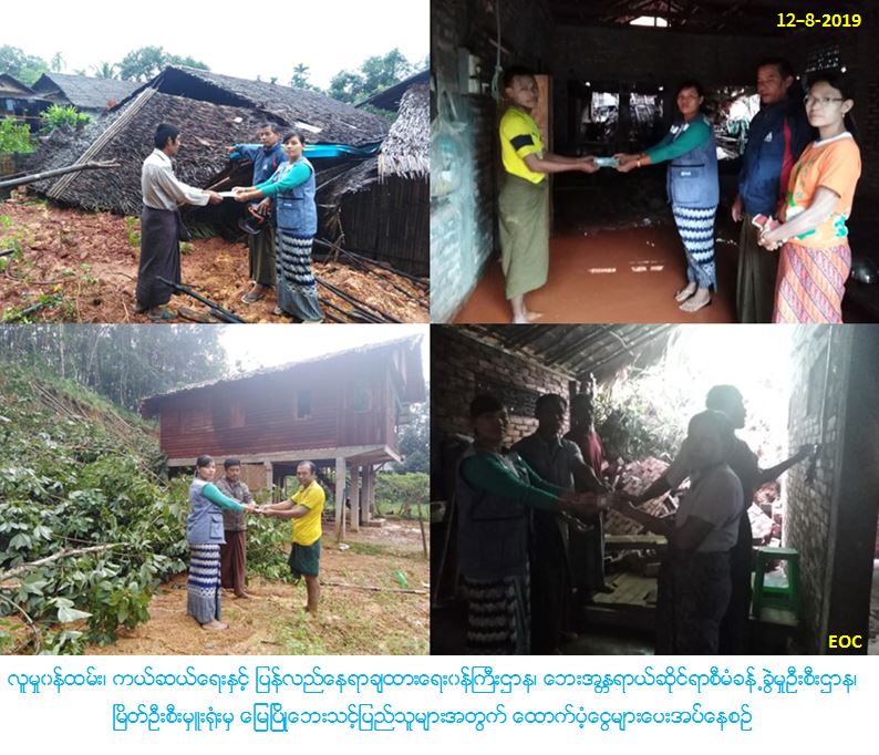 လူမှုဝန်ထမ်း၊ ကယ်ဆယ်ရေးနှင့် ပြန်လည်နေရာချထားရေးဝန်ကြီးဌာန၊ ဘေးအန္တရာယ်ဆိုင်ရာစီမံခန့်ခွဲမှုဦးစီးဌာန၊ မြိတ်ခရိုင်ဦးစီးမှူးရုံးမှ တာဝန်ရှိသူများသည် (၁၀-၈-၂၀၁၉)ရက် နေ့ ပုလောမြို့နယ်၊ ပလောက်မြို့ခန္တီကျေးရွာမှ မြေပြိုဘေးသင့်တစ်စိတ်တစ်ပိုင်းပျက်စီးနေအိမ်(၂)လုံးအတွက် အိမ်ဆောက်ပစ္စည်းဖိုးထောက်ပံ့ငွေ(၂၀၀၀၀၀/-)ကျပ်၊ လူဦးရေ(၁၆)ဦးတွက် ဆန်ရိက္ခာ (၇) ရက်စာဖိုးထောက်ပံ့ငွေ (၃၃၆၀၀/-)ကျပ်အား (၁၂-၈-၁၉)ရက်နေ့ နံနက်(၈း၃၀)တွင်လည်းကောင်း၊ ပုလောမြို့နယ်၊ ပလမြို့၊ အမှတ်(၃)ရပ်ကွက် မြေပြိုဘေးမှ တစ်စိတ်တစ်ပိုင်းပျက်စီး နေအိမ်(၃)လုံးအတွက် အိမ်ဆောက်ပစ္စည်းဖိုးထောက်ပံ့ငွေ (၃၀၀၀၀၀/-)ကျပ်နှင့် လူဦးရေ(၂၂)ဦးအတွက် ဆန်ရိက္ခာ (၇) ရက်စာဖိုးထောက်ပံ့ငွေ (၄၆၂၀၀/-) ကျပ်အား (၁၂-၈-၂၀၁၉)ရက်နေ့ မနက်(ရး၃၀)အချိန်တွင်လည်းကောင်း၊ ပုလောမြို့နယ်၊ သစ်လှတောကျေးရွာမှ မြေပြိုဘေးသင့် တစ်စိတ်တစ်ပိုင်းပျက်စီး နေအိမ်(၁)လုံးအတွက် အိမ်ဆောက်ပစ္စည်းဖိုးထောက်ပံ့ငွေ(၁၀၀၀၀၀/-)ကျပ်နှင့် လူဦးရေ(၆)ဦးအတွက် ဆန်ရိက္ခာ (၇) ရက်စာဖိုးထောက်ပံ့ငွေ (၁၂၆၀၀/-)ကျပ်အား (၁၂-၈-၂၀၁၉)ရက်နေ့ နံနက်(၉း၃၀)အချိန်တွင်လည်းကောင်း၊ ပုလောမြို့နယ်၊ ကျောင်းနိမ့်ကျေးရွာ မှ မြေပြိုဘေးကြောင့် တစ်စိတ်တစ်ပိုင်းပျက်စီး နေအိမ်(၂)လုံးအတွက် အိမ်ဆောက်ပစ္စည်းဖိုးထောက်ပံ့ငွေ (၁၈၀၀၀၀)ကျပ်နှင့် လူဦးရေ(၁၃)ဦးအတွက် ဆန်ရိက္ခာ (၇) ရက်စာဖိုးထောက်ပံ့ငွေ (၂၇၃၀၀/-)ကျပ်အား (၁၂-၈-၂၀၁၉)ရက်နေ့ နံနက်(၁၁း၀၀)အချိန်တွင်လည်းကောင်း သွားရောက်ထောက်ပံ့ပေးအပ်ခဲ့ပါကြောင်း သတင်းရရှိပါသည်။