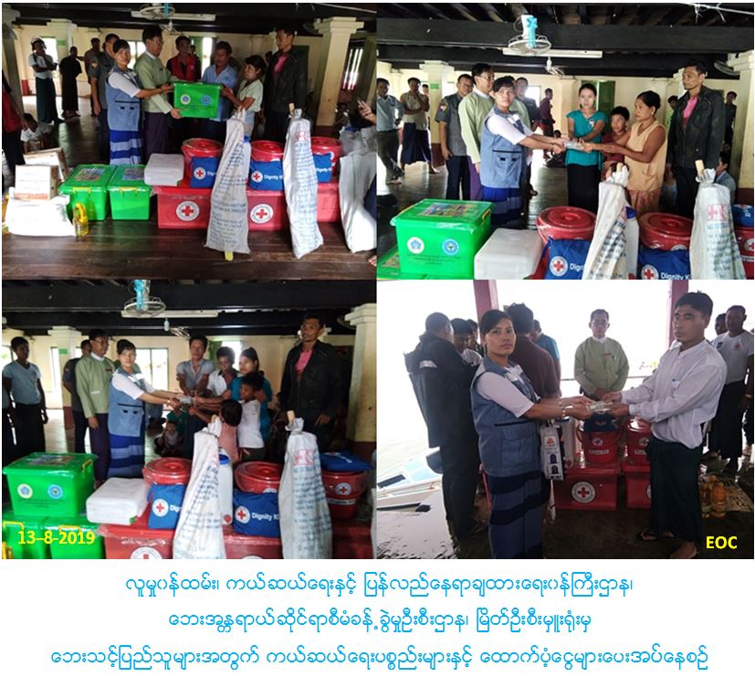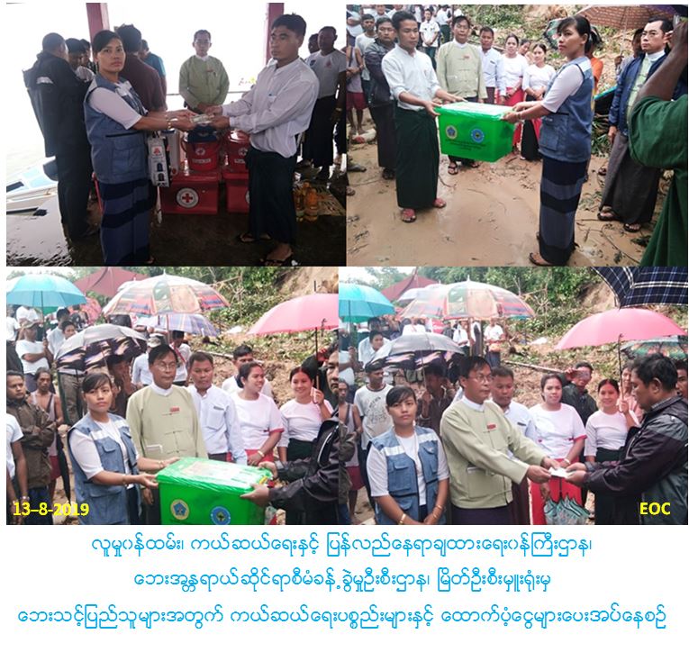 လူမှုဝန်ထမ်း၊ ကယ်ဆယ်ရေးနှင့် ပြန်လည်နေရာချထားရေးဝန်ကြီးဌာန၊ ဘေးအန္တရာယ်ဆိုင်ရာစီမံခန့်ခွဲမှုဦးစီးဌာန၊ မြိတ်ခရိုင်ဦးစီးမှူးရုံးမှ တာဝန်ရှိသူများသည် (၁၀-၈-၂၀၁၉) ရက်နေ့နှင့် (၁၁-၈-၂၀၁၉)ရက်နေ့များတွင် ကျွန်းစုမြို့နယ်အတွင်းရှိ ကျေးရွာအုပ်စု (၇)စု၊ ကျေးရွာ(၁၀)ရွာ၌ မိုးထန်စွာရွာသွန်း၍ မြေပြိုကျမှုကြောင့် ပြိုကျပျက်စီးခဲ့သော နေအိမ် (၂၂) လုံး နှင့် ရေမျောပျက်စီးနေအိမ်(၂)လုံး၊ စုစုပေါင်း(၂၄)လုံးအတွက် ကယ်ဆယ်ရေးပစ္စည်း(၁၅)မျိုး(၂၄)အိမ်ထောင်စာ၊ အိမ်ဆောက်ပစ္စည်းဖိုးထောက်ပံ့ငွေ(၂၆၀၀၀၀၀/-)ကျပ်၊ တစ်စိတ် တစ်ပိုင်းပျက်စီးနေအိမ်(၄)လုံးအတွက် အိမ်ဆောက်ပစ္စည်းဖိုးထောက်ပံ့ငွေ(၄၀၀၀၀၀/-)ကျပ်၊ ဘေးသင့်လူဦးရေ စုစုပေါင်း(၁၄၀)ဦးအတွက် ဆန်ရိက္ခာဖိုးထောက်ပံ့ငွေ(၂၉၄၀၀၀/-)ကျပ်ကို လည်းကောင်း၊ ပရည်ကျွန်းကျေးရွာ မြေပြိုဘေးမှကယ်ဆယ်ရေးစခန်းသို့ပြောင်းရွှေ့နေထိုင်သူဦးရေ(၅၁)ဦးအတွက် ဆန်ရိက္ခာဖိုးထောက်ပံ့ငွေ(၁၀၇၁၀၀/-)ကျပ်ကိုလည်းကောင်း၊ စလွန်အော်ကြီးကျေးရွာမှ မြေပိ သေဆုံးသူအမျိုးသမီး(၁)ဦးအတွက် ထောက်ပံ့ငွေ(၃၀၀၀၀၀/-)ကျပ်ကိုလည်းကောင်း၊ ပန်းဇင်ကျေးရွာမှ မြေပိ၍ ခြေကျိုးသွားသူ လူငယ်(၁)ဦးအတွက် ဆေးကုသစရိတ် (၅၀၀၀၀/-)ကျပ်ကိုလည်းကောင်း၊ (၁-၈-၂၀၁၉)ရက်နေ့နှင့် (၃-၈-၂၀၁၉)ရက်နေ့တို့တွင် လေပြင်းဘေးကြောင့် စခန်းသစ်ကျေးရွာအုပ်စု၊ ဝါးအော်ကျေးရွာမှ ပြိုလဲနေအိမ် (၁)လုံးအတွက် ကယ်ဆယ်ရေးပစ္စည်း(၁၅)မျိုး(၁)အိမ်ထောင်စာ၊ အိမ်ဆောက်ပစ္စည်းထောက်ပံ့ငွေ(၁၀၀၀၀၀/-)ကျပ်နှင့် စခန်းသစ်ကျေးရွာတွင် လေပြင်းဘေးကြောင့် ကယ်ဆယ်ရေးပစ္စည်း (၁၅)မျိုး(၃)အိမ်ထောင်စာ၊ အိမ်ဆောက်ပစ္စည်းဖိုးထောက်ပံ့ငွေ(၃၀၀၀၀၀/-)ကျပ်၊ ရေမြစ်ကြီးအုပ်စု၊ မနွယ်ကျေးရွာမှ တစ်စိတ်တစ်ပိုင်းပျက်စီးနေအိမ်(၁)လုံးအတွက် အိမ်ဆောက်ပစ္စည်းဖိုး ထောက်ပံ့ငွေ(၁၀၀၀၀၀/-)ကျပ်၊ စုစုပေါင်းလူဦးရေ (၂၇) ဦးအတွက် ဆန်ဖိုးထောက်ပံ့ငွေ(၅၆၇၀၀/-)ကျပ်အား (၁၃-၈-၂၀၁၉)ရက်နေ့ နံနက် (၉း၀၀)အချိန်တွင် ခရိုင်နှင့် မြို့နယ် သဘာဝဘေးကော်မတီအဖွဲ့ဝင်များ၊ ကြက်ခြေနီတပ်ဖွဲ့တို့နှင့်ပူးပေါင်း၍ ဘေးသင့်ပြည်သူများလက်ဝယ်သို့ အရောက်ပေးပို့ထောက်ပံ့ပေးအပ်ခဲ့ပါ ကြောင်း သတင်းရရှိ ပါသည်။