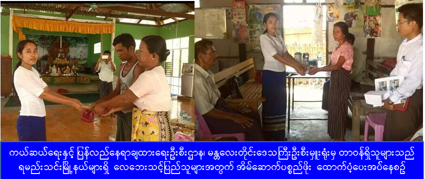 (၁၀-၅-၁၆) ရက်နေ့တွင် သာစည်မြို့၊ ပျော်ဘွယ် မြို့နှင့် ရမည်းသင်းမြို့နယ် များရှိ လေဘေးသင့်ပြည် သူများအတွက် ကယ်ဆယ် ရေးနှင့် ပြန်လည်နေရာ ချထားရေးဦးစီးဌာန၊ မန္တလေးတိုင်းဒေသကြီး ဦးစီးမှူးရုံးမှ တာဝန် ရှိသူများသည် သာစည်မြို့နယ်ရှိ ပြိုကျအိမ် (၈) လုံး၊ အမိုးလန်အိမ် (၁၈၃) လုံးအတွက် အိမ်ဆောက် ပစ္စည်းတန်ဖိုးငွေ စုစုပေါင်း (၄၀၆၀,၀၀၀) ကျပ်၊ ပျော်ဘွယ်မြို့ရှိ ပြိုကျအိမ် (၈) လုံး၊ အမိုးလန်အိမ် (၂၃ ) လုံးနှင့် သေဆုံးသူ (၁) ဦးအတွက် စုစုပေါင်းငွေ (၉၆၀,၀၀၀) ကျပ်နှင့် ရမည်းသင်းမြို့ရှိ ပြိုကျအိမ် (၃၃၇) လုံး၊ အမိုးလန်အိမ် (၂၈၃၇) လုံးအတွက် အိမ်ဆောက်ပစ္စည်းဖိုးငွေ (၇၃,၅၉၀,၀၀၀) တို့ကို သွားရောက်ထောက်ပံ့ခဲ့ကြောင်း သိရှိရပါသည်။