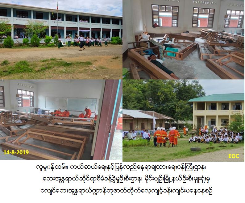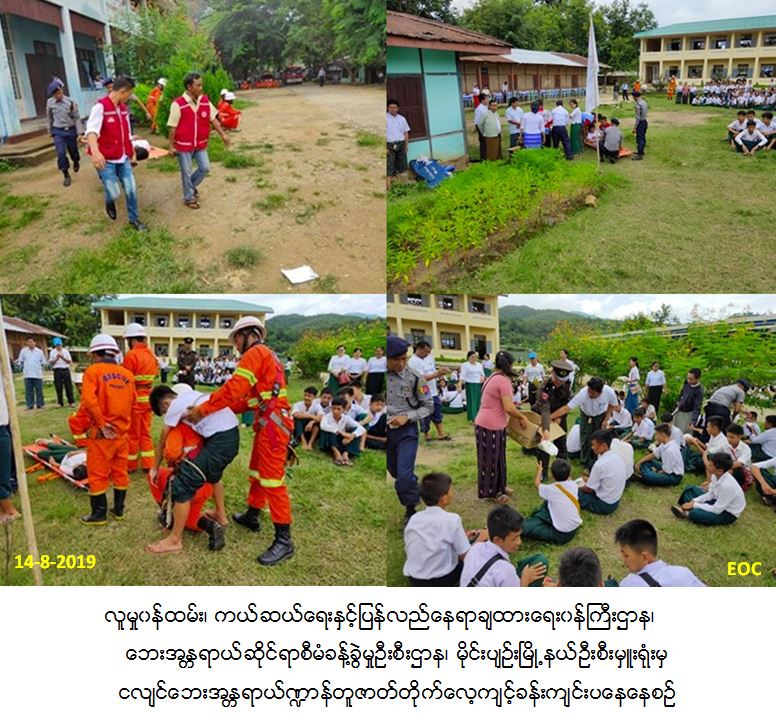 လူမှုဝန်ထမ်း၊ ကယ်ဆယ်ရေးနှင့် ပြန်လည်နေရာချထားရေးဝန်ကြီးဌာန၊ ဘေးအန္တရာယ်ဆိုင်ရာစီမံခန့်ခွဲမှုဦးစီးဌာန၊ မိုင်းပျဉ်းမြို့နယ်ဦးစီးမှူးရုံးမှ တာဝန်ရှိသူများသည် (၁၄-၈-၂၀၁၉)ရက်နေ့ နေ့လည်(၁၄းဝဝ)နာရီမှ (၁၅း၃၀)နာရီအထိ မိုင်းပျဉ်းမြို့နယ်၊ အခြေခံပညာအထက်တန်းကျောင်း၌ မိုင်းပျဉ်းမြို့နယ်သဘာဝဘေးစီမံခန့်ခွဲမှုကော်မတီ၏ဦးဆောင်မှုဖြင့် အခြေခံပညာအထက်တန်းကျောင်း၊ မြို့နယ်အထွေထွေအုပ်ချုပ်ရေးဦးစီးဌာန၊ ဘေးအန္တရာယ်ဆိုင်ရာစီမံခန့်ခွဲမှုဦးစီးဌာန၊ မီးသတ်ဦးစီးဌာန၊ ရဲတပ်ဖွဲ့အစရှိသည့် ဌာနဆိုင်ရာ များပူးပေါင်း၍ ငလျင်ဘေးအန္တရာယ်ဏ္ဍာန်တူဇာတ်တိုက်လေ့ကျင့်ခန်းကို ကျောင်းသား/ကျောင်းသူများ၊ ဆရာ/ဆရာမများ၊ ဌာနဆိုင်ရာများစုစုပေါင်းအင်အား (၂၀၀) ဦးဖြင့် ပြုလုပ်ဆောင်ရွက်ခဲ့ပါသည်။ အဆိုပါငလျင်ဇာတ်တိုက်လေ့ကျင့်ခန်းတွင်(၁၃-၈-၂၀၁၉)ရက်နေ့တွင် ဘေးအန္တရာယ်ဆိုင်ရာစီမံခန့်ခွဲမှုဦးစီးဌာန၊ မိုင်းပျဉ်းမြို့နယ်ဦးစီးမှူးရုံးမှတာဝန်ရှိသူများသည် ငလျင်ဘေးနှင့်ပတ်သက်၍လည်းကောင်း၊ ကြက်ခြေနီမှရှေးဦးသူနာပြုစုနည်းကိုလည်းကောင်း အသီးသီးဟောပြောဆွေးနွေးခဲ့ကြပါသည်။ (၁၄-၈-၂၀၁၉)ရက်နေ့ နေ့လည်(၁၄း၀၀)နာရီ တွင် ငလျင်ဇာတ်တိုက်လေ့ကျင့်ခန်းပြုလုပ်ရာတွင် ရဲတပ်ဖွဲ့မှ ဝစီမှုတ်ပြီး ငလျင်လှုပ်ခတ်ကြောင်းအသိပေးခြင်း၊ ဆရာ/ဆရာမများမှဦးဆောင်၍ ဘေးလွတ်ရာသို့ပြေးထွက်ခြင်း၊ မီးသတ်ဦးစီးဌာနမှ မီးငြိမ်းသတ်မှုများသရုပ်ပြသခြင်း၊ ရှာဖွေကယ်ဆယ်ရေးလုပ်ငန်းများဆောင်ရွက်ခြင်း၊ ကြက်ခြေနီမှရှေးဦးသူနာပြုစုပြီး ကျန်းမှာရေးဌာနသို့ဆက်လက်လွှဲပြောင်းခြင်း၊ ရဲတပ်ဖွဲ့မှလုံခြုံရေးဆောင်ရွက်ပေးခြင်း၊ကော်မတီများမှ စားနပ်ရိက္ခာများ ထောက်ပံပေးခြင်းများဆောင်ရွက်ခဲ့ပါကြောင်း သတင်းရရှိပါသည်။