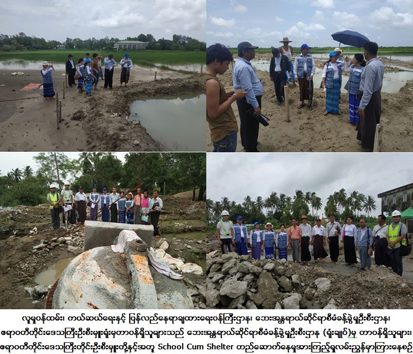 လူမှုဝန်ထမ်း၊ ကယ်ဆယ်ရေးနှင့် ပြန်လည်နေရာချထားရေးဝန်ကြီးဌာန၊ ဘေးအန္တရာယ်ဆိုင်ရာစီမံခန့်ခွဲမှုဦးစီး ဌာန၊ ဧရာဝတီတိုင်းဒေသကြီးဦးစီးမှူးရုံးမှတာဝန်ရှိသူများသည် ဘေးအန္တရာယ်ဆိုင်ရာစီမံခန့်ခွဲမှုဦးစီးဌာန (ရုံးချုပ်)မှ တာဝန်ရှိသူများ၊ ဧရာဝတီတိုင်းဒေသကြီးတိုင်းဦးစီးမှူးတို့နှင့်အတူ အမျိုးသားသဘာဝဘေးစီမံခန့်ခွဲမှု ကော်မတီရန်ပုံငွေဖြင့် လပွတ္တာခရိုင်၊ လပွတ္တာမြို့နယ်၊ သစ်ပုတ်ကျေးရွာအုပ်စု၊ သောင်လေးကျေးရွာ၊ ရေတွင်းဆိပ်ကျေးရွာအုပ်စု၊ ရေတွင်းဆိပ်ကျေးရွာ၊ ဓနိဆိပ်ကျေးရွာအုပ်စု၊ ဓနိဆိပ်ကျေးရွာတို့၌ တည်ဆောက်လျက်ရှိသည့် School Cum Shelter တည်ဆောက်နေမှုအခြေအနေတို့ကို (၁၄-၈-၂၀၁၉) ရက်နေ့နှင့် (၁၅-၈-၂၀၁၉) ရက်နေ့တို့တွင် သွားရောက်ကြည့်ရှုလမ်းညွှန်မှာကြားခဲ့ပါကြောင်း သတင်းရရှိပါ သည်။