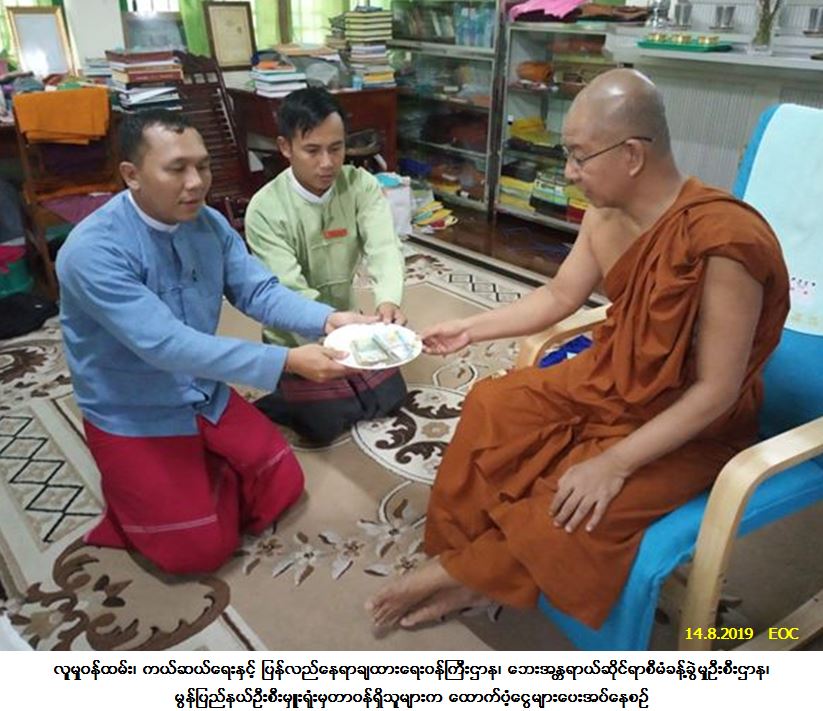 လူမှုဝန်ထမ်း၊ ကယ်ဆယ်ရေးနှင့် ပြန်လည်နေရာချထားရေးဝန်ကြီးဌာန၊ ဘေးအန္တရာယ်ဆိုင်ရာစီမံခန့်ခွဲမှုဦးစီး ဌာန၊ မွန်ပြည်နယ်ဦးစီးမှူးရုံးမှတာဝန်ရှိသူများသည် မော်လမြိုင်မြို့၊ ဗဟိုလမ်း၌ (၉-၈-၂၀၁၉) ရက်နေ့၊ (၀၄:၀၀)နာရီခန့်တွင် ဖြစ်ပွားခဲ့သော မိုးသည်းထန်စွာရွာသွန်း၍ ဝေဇယျန္တာကျောင်းတိုက်အနောက်ဖက် အုတ်တံတိုင်းပိကျောင်းပြိုကျကာ ပျံလွန်တော်မူခဲ့သည့်ဆရာတော် (၁) ပါးအတွက် သေဆုံးထောက်ပံ့ငွေ (၃၀၀,၀၀၀/-) ကျပ်နှင့် ကျောင်းဆောက်ပစ္စည်းဖိုးထောက်ပံ့ငွေ (၂၀၀,၀၀၀/-) ကျပ်ကို (၁၄-၈-၂၀၁၉) ရက်နေ့တွင် ကျန်ရစ်သူကျောင်းတိုက်ဆရာတော်ထံသို့ သွားရောက်ထောက်ပံ့ခဲ့ပါကြောင်း သတင်းရရှိပါသည်။