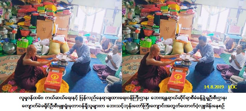 လူမှုဝန်ထမ်း၊ ကယ်ဆယ်ရေးနှင့် ပြန်လည်နေရာချထားရေးဝန်ကြီးဌာန၊ ဘေးအန္တရာယ်ဆိုင်ရာစီမံခန့်ခွဲမှုဦးစီး ဌာန၊ ကျောက်မဲခရိုင်ဦးစီးမှူးရုံးမှတာဝန်ရှိသူများသည် ကျောက်မဲမြို့၊ အမှတ်(၃)ရပ်ကွက်၊ စိန်ကျောက်တောင်ဘုန်းတော်ကြီးကျောင်း၌ (၁၁-၈-၂၀၁၉) ရက်နေ့တွင်ဖြစ်ပွားခဲ့သော မီးလောင်မှုကြောင့် ဘေးသင့်ဘုန်းတော်ကြီးကျောင်းအတွက် ကျောင်းဆောက်ပစ္စည်းဖိုးထောက်ပံ့ငွေ (၃၀၀,၀၀၀/-)ကျပ်၊ ဘုန်းတော်ကြီး (၂၃) ပါးအတွက် ဆွမ်းဆန်ဖိုးထောက်ပံ့ငွေ(၄၈,၃၀၀/-)ကျပ်၊ ဒွိစုံသင်္ကန်း (၂၃) စုံအတွက်ထောက်ပံ့လှူဒါန်းငွေ (၂၆၀,၀၀၀/-) ကျပ်တို့ကို (၁၄-၈-၂၀၁၉) ရက်နေ့၊ (၁၄း၀၀) အချိန်တွင် ကျောက်မဲမြို့နယ်အုပ်ချုပ်ရေးမှူး၊ ခရိုင်သာသနာရေးဦးစီးမှူး၊ မြို့မိ/မြို့ဖများနှင့်အတူ သံဃာတော်များအား ထောက်ပံ့ဆည်းကပ်လှူဒါန်းခဲ့ပါကြောင်း သတင်းရရှိပါသည်။