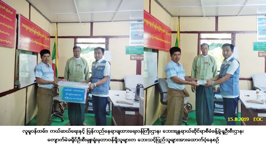 လူမှုဝန်ထမ်း၊ ကယ်ဆယ်ရေးနှင့် ပြန်လည်နေရာချထားရေးဝန်ကြီးဌာန၊ ဘေးအန္တရာယ်ဆိုင်ရာစီမံခန့်ခွဲမှုဦးစီး ဌာန၊ ကျောက်မဲခရိုင်ဦးစီးမှူးရုံးမှတာဝန်ရှိသူများသည် သီပေါမြို့နယ်၊ မိုးတေကျေးရွာအုပ်စု၊ နောင်သကြားကျေးရွာ၌ (၁၁-၈-၂၀၁၉) ရက်နေ့တွင် ဖြစ်ပွားခဲ့သော မီးဘေးကြောင့် ပျက်စီးနေအိမ် (၁) လုံးအတွက် အိမ်ဆောက်ပစ္စည်းဖိုးထောက်ပံ့ငွေ (၂၀၀,၀၀၀/-) ကျပ်၊ ကယ်ဆယ်ရေးပစ္စည်း (၂၁) မျိုးအိမ်ထောင်စု(၁)စုစာ၊ ဘေးသင့်လူဦးရေ (၈) ဦးအတွက် ဆန်ရိက္ခာ(၇)ရက်စာဖိုးထောက်ပံ့ငွေ (၁၆,၈၀၀/-) ကျပ်တို့ကို (၁၅-၈-၂၀၁၉) ရက်နေ့၊ (၁၀း၀၀)နာရီအချိန်တွင် သီပေါမြို့နယ်အုပ်ချုပ်ရေးမှူးနှင့်အတူ ပြည်သူများလက်ဝယ်အရောက် ထောက်ပံ့ပေးအပ်ခဲ့ပါကြောင်းသတင်းရရှိပါသည်။