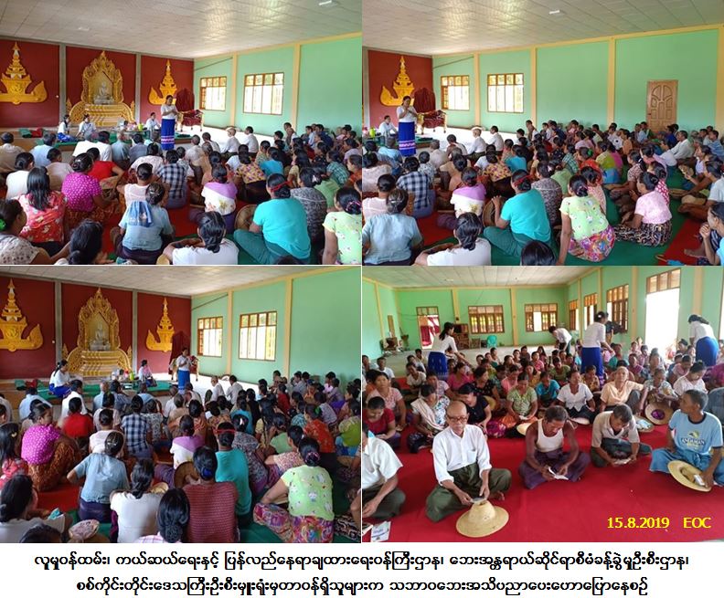 လူမှုဝန်ထမ်း၊ ကယ်ဆယ်ရေးနှင့် ပြန်လည်နေရာချထားရေးဝန်ကြီးဌာန၊ ဘေးအန္တရာယ်ဆိုင်ရာစီမံခန့်ခွဲမှုဦးစီး ဌာန၊ စစ်ကိုင်းတိုင်းဒေသကြီးဦးစီးမှူးရုံးမှတာဝန်ရှိသူများသည် စစ်ကိုင်းတိုင်းဒေသကြီး၊ ကနီမြို့နယ်၊ ကျော်ရွာကျေးရွာ၌ (၁၆-၈-၂၀၁၉) ရက်နေ့၊ နေ့လယ် (၀၁း၃၀)အချိန်မှ (၀၂း၃၀)အချိန်အထိ ကျေးရွာသူ/ ကျေးရွာသား(၁၀၀)ဦးတို့ကို သဘာဝဘေးအသိပညာပေးဟောပြောခဲ့ပြီး တက်ရောက်လာသူများအား သဘာဝဘေးနှင့်စပ်လျဉ်း၍ ဆောင်ရန်/ရှောင်ရန်အချက်များပါသည့် လက်ကမ်းစာစောင်များ ဖြန့်ဝေခဲ့ပါကြောင်းသတင်း ရရှိပါသည်။