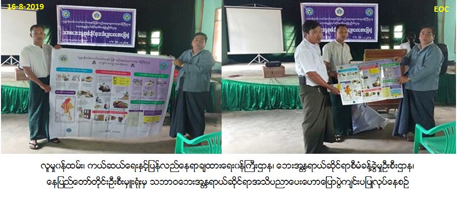 လူမှုဝန်ထမ်း၊ ကယ်ဆယ်ရေးနှင့် ပြန်လည်နေရာချထားရေးဝန်ကြီးဌာန၊ ဘေးအန္တရာယ်ဆိုင်ရာစီမံခန့်ခွဲမှုဦးစီးဌာန၊ နေပြည်တော်တိုင်းဦးစီးမှူးရုံးမှ တာဝန်ရှိသူများသည် (၁၆-၈-၂၀၁၉) ရက်နေ့၊ (၁၃း၀၀)အချိန်မှ (၁၄း၃၀)အချိန်အထိ ပျဉ်းမနားမြို့နယ်၊ ဇီးဖြူပင်ကျေးရွာအုပ်စု၊ အ.ထ.က (ခွဲ)ဇီးဖြူပင်စာသင်ကျောင်းတွင် ကျောင်းသား/ကျောင်းသူနှင့် ကျေးရွာသူ/ကျေးရွာသား (၁၅၀)ဦးကို သဘာဝဘေးအန္တရာယ်ဆိုင်ရာများနှင့်ပတ်သက်သော ဆောင်ရန်/ရှောင်ရန်အချက်များအား သိရှိလိုက်နာဆောင်သိရှိလိုက်နာဆောင်ရွက်နိုင်ရေးအတွက် သဘာဝဘေးအသိပညာပေးဟောပြောပွဲကိုကျင်းပပြုလုပ်ခဲ့ပြီး တက်ရောက်လာသူများကို သဘာဝဘေးအသိပညာပေးလက်ကမ်းစာစောင်များ၊ ဗီနိုင်းပိုစတာများနှင့် နံရံကပ်ပိုစတာများဖြန့်ဝေပေးခဲ့ပါကြောင်း သတင်းရရှိပါသည်။