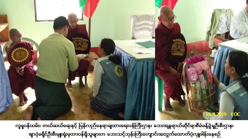 လူမှုဝန်ထမ်း၊ ကယ်ဆယ်ရေးနှင့် ပြန်လည်နေရာချထားရေးဝန်ကြီးဌာန၊ ဘေးအန္တရာယ်ဆိုင်ရာစီမံခန့်ခွဲမှုဦးစီး ဌာန၊ ဖျာပုံခရိုင်ဦးစီးမှူးရုံးမှတာဝန်ရှိသူများသည် ဖျာပုံမြို့နယ်၊ အမာမြို့၊ ဘဝသစ်ကျေးရွာအုပ်စု၊ သမိန်ပုလဲ ကျေးရွာ၊ ဖွားဆိပ်လှခါးပြတ်ရေရိုး၌ (၁၅-၈-၂၀၁၉) ရက်နေ့တွင် ဖြစ်ပွားခဲ့သော လေပြင်းတိုက်ခတ်မှုကြောင့် ဘေးသင့်ဘုန်းကြီးကျောင်း (၁) ကျောင်းအတွက် ကျောင်းဆောက်ပစ္စည်းဖိုးထောက်ပံ့ငွေ (၁၀၀,၀၀၀/-) ကျပ်နှင့် ဒွိစုံသင်္ကန်း (၂) စုံတို့ကို (၁၆-၈-၂၀၁၉) ရက်နေ့တွင် သွားရောက်ထောက်ပံ့ပေးအပ်ခဲ့ပါကြောင်း သတင်းရရှိပါသည်။