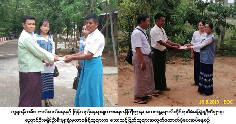 လူမှုဝန်ထမ်း၊ ကယ်ဆယ်ရေးနှင့် ပြန်လည်နေရာချထားရေးဝန်ကြီးဌာန၊ ဘေးအန္တရာယ်ဆိုင်ရာစီမံခန့်ခွဲမှုဦးစီး ဌာန၊ ညောင်ဦးခရိုင်ဦးစီးမှူးရုံးမှတာဝန်ရှိသူများသည် ညောင်ဦးမြို့နယ်၊ ပျဉ်တိုင်းကျေးရွာနှင် စည်သာကျေးရွာ တို့၌ (၁၁-၈-၂၀၁၉) ရက်နေ့၊ (၁၈း၃၀) အချိန်တွင်ဖြစ်ပွားခဲ့သော လေပြင်းတိုက်ခတ်မှုကြောင့် တစ်စိတ်တစ်ပိုင်းပျက်စီးနေအိမ် (၂)လုံး၊ အိမ်ထောင်စု (၂) စုမှ လူဦးရေ (၇) ဦးအတွက် ဆန်ရိက္ခာ (၇)ရက်စာ ဖိုးထောက်ပံ့ငွေ (၁၄,၇၀၀/-) ကျပ်နှင့် အိမ်ဆောက်ပစ္စည်းဖိုးထောက်ပံ့ငွေ (၇၀,၀၀၀/-) ကျပ်တို့ကို (၁၆-၈-၂၀၁၉) ရက်နေ့တွင် ဘေးသင့်ပြည်သူများလက်ဝယ်အရောက် သွားရောက်ထောက်ပံ့ပေးခဲ့ပါကြောင်း သတင်းရရှိပါသည်။