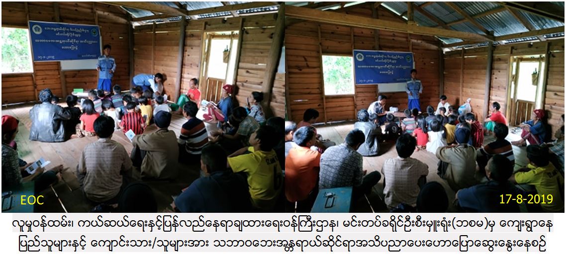 လူမှုဝန်ထမ်း၊ ကယ်ဆယ်ရေးနှင့်ပြန်လည်နေရာချထားရေးဝန်ကြီးဌာန၊ ဘေးအန္တရာယ်ဆိုင်ရာစီမံခန့်ခွဲမှုဦးစီးဌာန၊ မင်းတပ်ခရိုင်ဦးစီးမှူးရုံးမှ (၁၇.၈.၂၀၁၉)ရက်နေ့ မင်းတပ်မြို့၊ ဘောင်ထဲကျေးရွာရှိ ပြည်သူများနှင့် အ.ထ.က(၃) ကျောင်းသား/သူ အင်အား (၃၅)ဦးကို သဘာဝဘေးအန္တရာယ်ဆိုင်ရာ အသိပညာပေးဟောပြောပွဲအား ကျင်းပပြုလုပ်ခဲ့ကြောင်း သတင်းရရှိပါသည်။