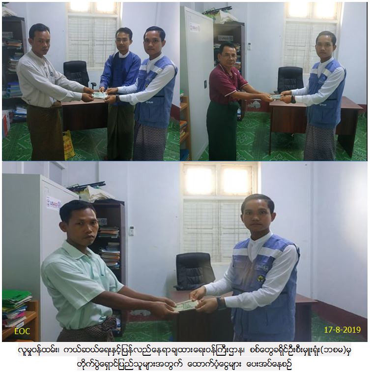 လူမှုဝန်ထမ်း၊ ကယ်ဆယ်ရေးနှင့်ပြန်လည်နေရာချထားရေးဝန်ကြီးဌာန၊ ဘေးအန္တရာယ်ဆိုင်ရာစီမံခန့်ခွဲမှုဦးစီးဌာန၊ စစ်တွေခရိုင်ဦးစီးမှူးရုံးမှ ရသေ့တောင်မြို့နယ်အတွင်း တိုက်ပွဲများကြောင့် စစ်တွေမြို့ ဆွေမျိုးများနေအိမ်တွင် ယာယီခိုလုံလျက်ရှိသော အိမ်ထောင်စု(၄)စုမှ လူဦးရေ(၁၁)ဦး၊ အိမ်ထောင်စု(၄)စုမှ လူဦးရေ(၁၂)ဦးနှင့် အိမ်ထောင်စု(၁)စုမှ လူဦးရေ(၅)ဦး၊ စုစုပေါင်း အိမ်ထောင်စု(၉)စု၊ လူဦးရေ(၂၈)ဦးအတွက် ဆန်ရိက္ခာ(၂)ပတ်စာဖိုး ထောက်ပံ့ငွေ(၁၁၇၆၀၀ိ/-)အား(၁၆.၈.၁၉)ရက်တွင် ထောက်ပံ့ပေးအပ်ခဲ့ကြောင်း သတင်းရရှိပါသည်။