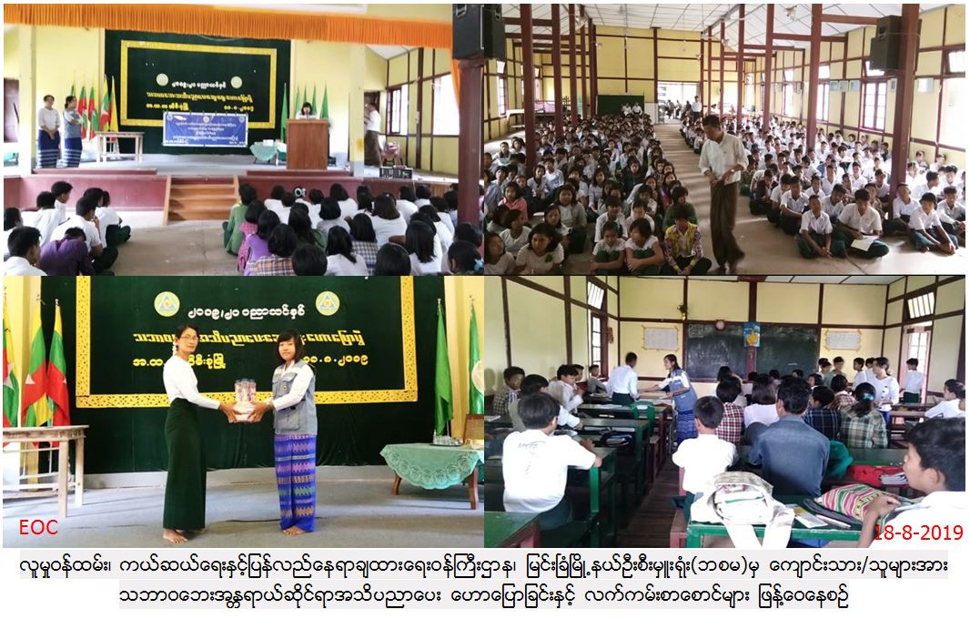 လူမှုဝန်ထမ်း၊ ကယ်ဆယ်ရေးနှင့် ပြန်လည်နေရာချထားရေးဝန်ကြီးဌာန၊ ဘေးအန္တရာယ်ဆိုင်ရာစီမံခန့်ခွဲမှုဦးစီးဌာန၊ မြင်းခြံမြို့နယ်ဦးစီးမှူးရုံးမှ တာဝန်ရှိသူများသည် (၁၈-၈-၂၀၁၉) ရက်နေ့တွင် မြင်းခြံမြို့နယ်၊ ဆီမီးခုံ အခြေခံပညာအထက်တန်းကျောင်း အ.ထ.က(ဆီမီးခုံ)၌ သဘာဝဘေးအသိပညာပေးဟောပြောပွဲကျင်းပပြုလုပ်ခဲ့ရာ ကျောင်းသူ/ ကျောင်းသား(၄၂၇)ဦးခန့်တက်ရောက်ခဲ့ပြီး တက်ရောက်လာသူများအား သဘာဘေးအန္တရာယ်နှင့်စပ်လျဉ်း၍ ဆောင်ရန်/ရှောင်ရန်အချက်များကို အသိပညာပေးဆွေးနွေးခဲ့ပြီး စာအုပ်များ၊ ဘောပင်များနှင့် လက်ကမ်းစာစောင်များဖြန့်ဝေခဲ့ကြောင်း သတင်းရရှိပါသည်။