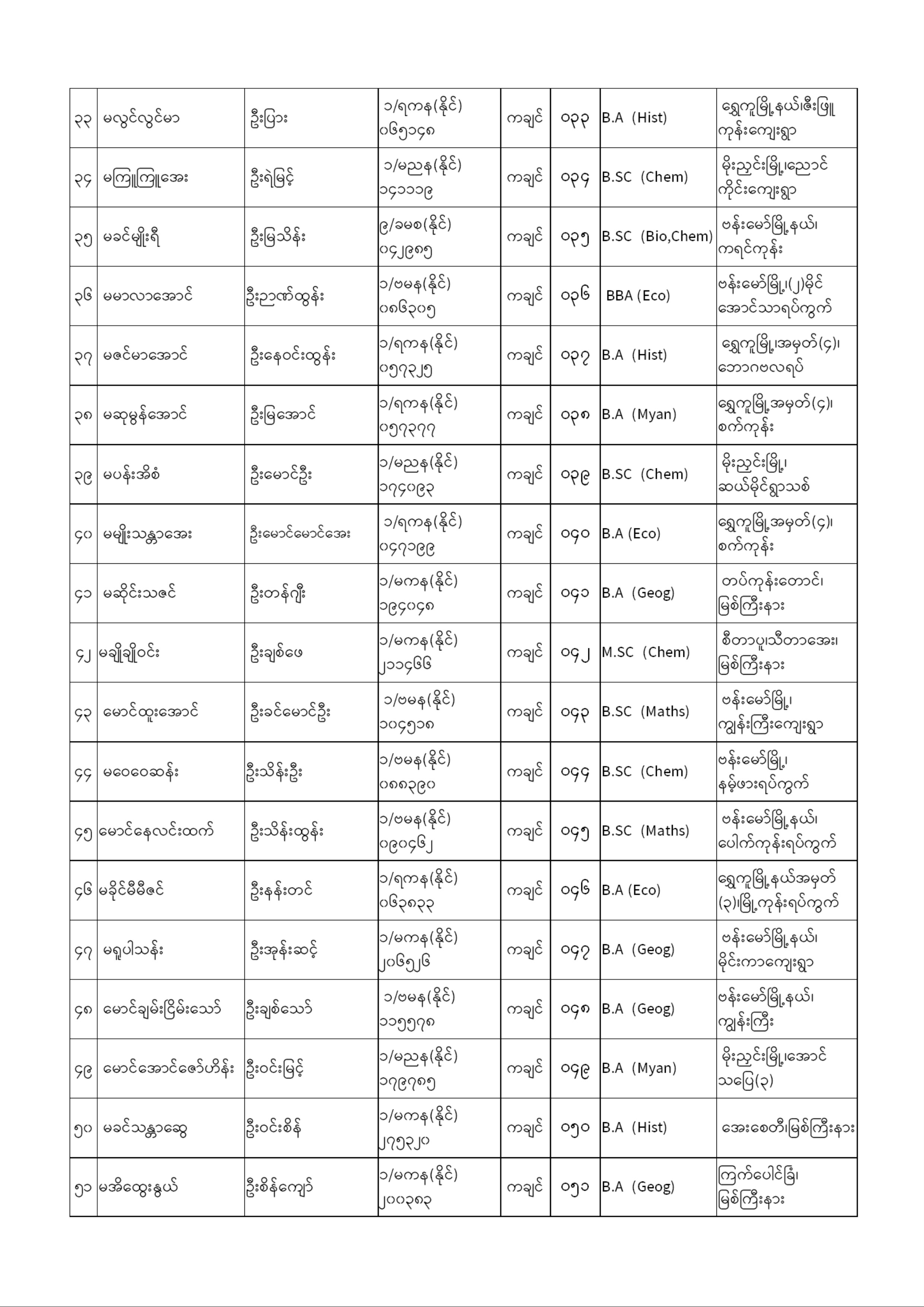 လူမှုဝန်ထမ်း၊ ကယ်ဆယ်ရေးနှင့် ပြန်လည်နေရာချထားရေးဝန်ကြီးဌာန၊ ဘေးအန္တရာယ်ဆိုင်ရာစီမံခန့်ခွဲမှုဦးစီးဌာနမှ ခေါ်ယူထားသော အငယ်တန်းစာရေးနှင့် ပစ္စည်းထိန်း (၅) ရာထူးလျှောက်ထားသူများအတွက် ကချင်ပြည်နယ်မှ ဖြေဆိုခွင့်ရရှိသူအမည်နှင့် ခုံအမှတ်စာရင်း
