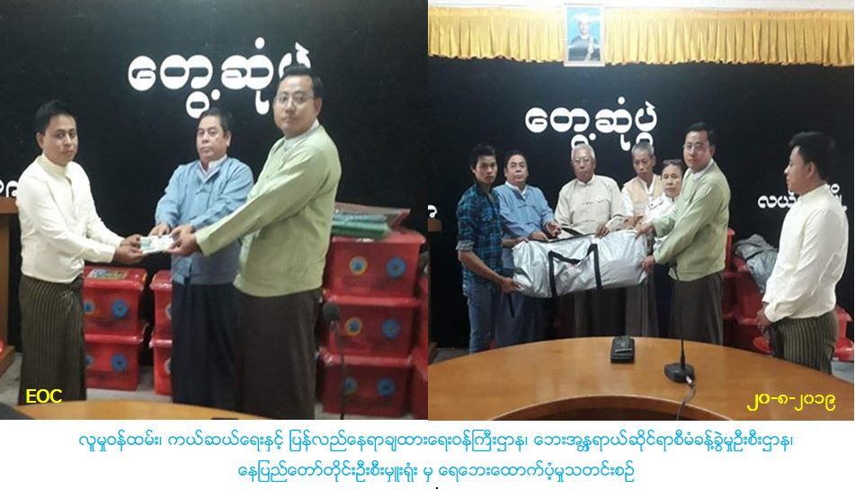 လူမှုဝန်ထမ်း၊ ကယ်ဆယ်ရေးနှင့် ပြန်လည်နေရာချထားရေးဝန်ကြီးဌာန၊ ဘေးအန္တရာယ်ဆိုင်ရာစီမံခန့်ခွဲမှုဦးစီးဌာန၊ ပြည်ထောင်စုနယ်မြေ၊ နေပြည်တော်တိုင်းဦးစီးမှူးရုံးမှ တာဝန်ရှိသူများသည် ဒက္ခိဏခရိုင်၊ လယ်ဝေးမြို့နယ်အတွင်း (၁၈-၈-၂၀၁၉) ရက်နေ့တွင် မိုးသည်းထန်စွာရွာသွန်းပြီး ချောင်းရေမြင့်တက်လာမှုကြောင့် ကျေးရွာအုပ်စု (၆)စုရှိ ရေနောက်မျောပါ၊ ပြိုလဲနေအိမ်နှင့် ကြိုတင်ဖျက်သိမ်းနေအိမ် စုစုပေါင်း (၁၁)လုံးအတွက် အိမ်ဆောက် ပစ္စည်းဖိုးထောက်ပံ့ငွေ (၁၁၀၀၀၀ဝိ/-)ကျပ်အားလည်းကောင်း၊ ကယ်ဆယ်ရေးပစ္စည်း(၁၆)မျိုးနှင့် (၁၀)မျိုးပါ (၁၁)အိမ်ထောင်စာ အတွက်လည်းကောင်း၊ လူဦးရေ (၄၇)ဦးအတွက် ဆန်ရိက္ခာဖိုးထောက်ပံ့ငွေ (၉၈၇၀ဝိ/-)ကျပ် အားလည်းကောင်း၊ စုစုပေါင်းထောက်ပံ့ရန်ပုံငွေ (၁၁၉၈၇၀ဝိ/-)ကျပ်အား (၂၀-၈-၂၀၁၉) ရက်နေ့တွင် ဘေးသင့် ပြည်သူများလက်ဝယ်သို့ သွားရောက်ထောက်ပံ့ခဲ့ပါကြောင်း သတင်းရရှိပါသည်။