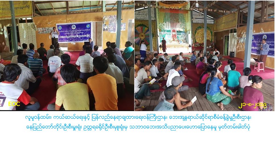 လူမှုဝန်ထမ်း၊ ကယ်ဆယ်ရေးနှင့် ပြန်လည်နေရာချထားရေးဝန်ကြီးဌာန၊ဘေးအန္တရာယ်ဆိုင်ရာစီမံခန့်ခွဲမှုဦးစီးဌာန၊ နေပြည်တော်တိုင်းဦးစီးမှူးရုံး ဥတ္တရခရိုင်ဦးစီးမှူးရုံးမှ တာဝန်ရှိသူများသည် (၂၁-၈-၂၀၁၉) ရက်နေ့၊ (၁၀း၄၅) အချိန်မှ (၁၂း၀၀) အချိန်အထိ လယ်ဝေးမြို့နယ်၊ ပင်သောင်းကျးရွာအုပ်စု၊ ရွှေတိုက်တန်းကျေးရွာတွင် ကျေးရွာသူ/ကျေးရွာသားများအား သဘာဝဘေးအန္တရာယ်ဆိုင်ရာ အသိပညာများနှင့်ပတ်သက်သော ဆောင်ရန်/ ရှောင်ရန်အချက်များအား သိရှိလိုက်နာဆောင်ရွက်နိုင်ရေးအတွက် သဘာဝဘေးအသိပညာပေး ဟောပြောပွဲကို ကျင်းပပြုလုပ်ခဲ့ရာ ပြည်သူလူထု (၈၀)ဦးခန့် တက်ရောက်ခဲ့ပြီး အဆိုပါတက်ရောက်လာသူများအား သဘာဝ ဘေးအသိပညာပေးလက်ကမ်းစာစောင်များ၊ ဗီနိုင်းပိုစတာများနံရံကပ်ပိုစတာများနှင့် မုန့်များဖြန့်ဝေပေးခဲ့ပါကြောင်း သတင်းရရှိသည်။