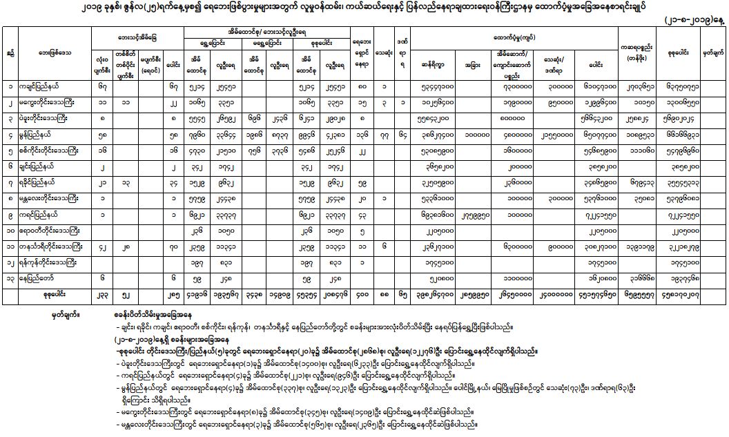 ၂၀၁၉ ခုနှစ်၊ ဇွန်လ (၂၅) ၊ ရက်နေ့မှစ၍ ရေဘေးဖြစ်ပွားမှုများအတွက် လူမှုဝန်ထမ်း၊ ကယ်ဆယ်ရေးနှင့် ပြန်လည်နေရာချထားရေးဝန်ကြီးဌာနမှ (၂၁-၈-၂၀၁၉ရက်နေ့ထိ) ရေဘေးဖြစ်ပွားမှုနှင့် ထောက်ပံ့မှုအခြေအနေစာရင်းချုပ်