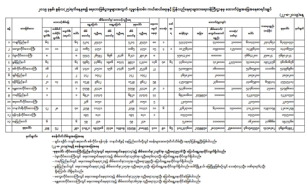 ၂၀၁၉ ခုနှစ်၊ ဇွန်လ (၂၅) ၊ ရက်နေ့မှစ၍ ရေဘေးဖြစ်ပွားမှုများအတွက် လူမှုဝန်ထမ်း၊ ကယ်ဆယ်ရေးနှင့် ပြန်လည်နေရာချထားရေးဝန်ကြီးဌာနမှ (၂၂-၈-၂၀၁၉ရက်နေ့ထိ) ရေဘေးဖြစ်ပွားမှုနှင့် ထောက်ပံ့မှုအခြေအနေစာရင်းချုပ်