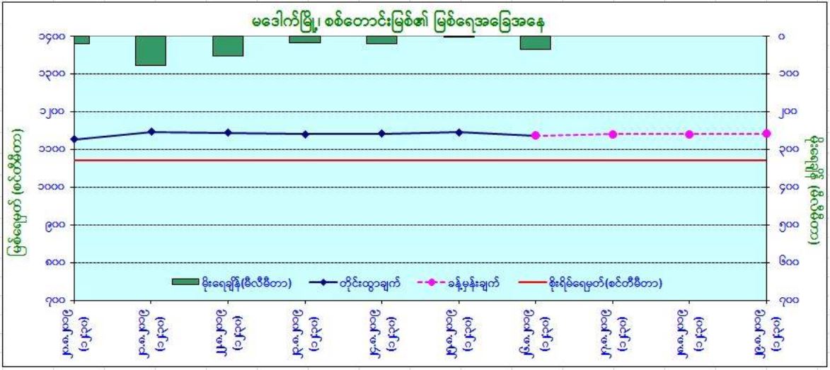 ယနေ့မြန်မာစံတော်ချိန် (၁၂:၃၀)နာရီအချိန် တိုင်းထွာချက်အရ စစ်တောင်းမြစ်ရေသည် မဒေါက်မြို့တွင် (၂)ပေခန့် ယင်းမြို့၏ စိုးရိမ်ရေမှတ်အထက်သို့ ကျော်လွန်နေပြီး နောက်(၃)ရက်အတွင်း ယင်းမြို့၏ စိုးရိမ်ရေမှတ်အထက် ဆက်လက်တည်ရှိနိုင်ပါသည်။