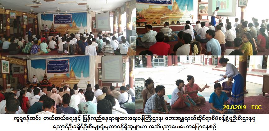 လူမှုဝန်ထမ်း၊ ကယ်ဆယ်ရေးနှင့် ပြန်လည်နေရာချထားရေးဝန်ကြီးဌာန၊ ဘေးအန္တရာယ်ဆိုင်ရာစီမံခန့်ခွဲမှုဦးစီး ဌာန၊ ညောင်ဦးခရိုင်ဦးစီးမှူးရုံးမှတာဝန်ရှိသူများသည် (၂၀-၈-၂၀၁၉) ရက်နေ့၊ (၁၀း၃၀) နာရီအချိန်တွင် ညောင်ဦးမြို့နယ်၊ ရွှေစည်းခုံစေတီရင်ပြင်တော်ပေါ်၌ ငလျင်ဘေးအန္တရာယ်နှင့်စပ်လျဉ်း၍ ဆောင်ရန်/ရှောင်ရန် အချက်များကို အသိပညာပေးဟောပြောခဲ့ရာ ရွှေစည်းခုံ၊ အာနန္ဒာ၊ ထီးလိုမင်းလို၊ ဓမ္မရံကြီး၊ မဟာငှက်ပစ်တောင်နှင့် စူဠာမဏိစေတီတော်တို့မှ ဂေါပကအဖွဲ့ဝင်များ၊ ဘုရားဝေယျာဝိစ္စဆောင်ရွက်သူများ စုစုပေါင်းလူဦးရေ (၂၀၀) ဦးခန့်တက်ရောက်ခဲ့ပြီး တက်ရောက်လာသူများအား ငလျင်ဘေးအသိပညာပေး လက်ကမ်းစာစောင်များ ဖြန့်ဝေခဲ့ပါကြောင်း သတင်းရရှိပါသည်။