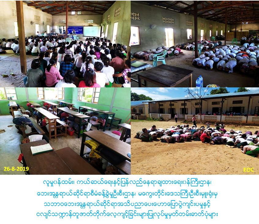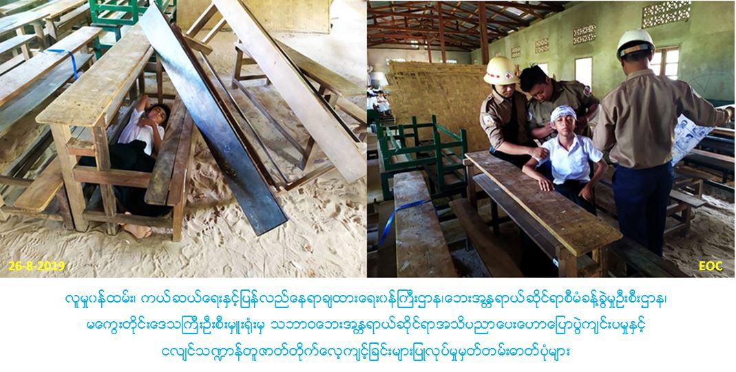 လူမှုဝန်ထမ်း၊ ကယ်ဆယ်ရေးနှင့် ပြန်လည်နေရာချထားရေးဝန်ကြီးဌာန၊ ဘေးအန္တရာယ်ဆိုင်ရာစီမံခန့်ခွဲမှုဦးစီးဌာန၊ မကွေးတိုင်းဒေသကြီးဦးစီးမှူးရုံးမှ တာဝန်ရှိသူများသည် ကြက်ခြေနီတပ်ဖွဲ့နှင့်ပူးပေါင်း၍ (၂၆-၈-၂၀၁၉)ရက်နေ့ (၁၄း၀၀)နာရီအချိန်တွင် မကွေးမြို့(အ.မ.က(လွန်)ကျောင်း)ချောင်းဖြူကျေးရွာတွင် ငလျင်ဘေးအန္တရာယ်နှင့်ပတ်သက်၍ ဟောပြောခြင်းနှင့် ငလျင်လှုပ်နေစဉ် ဘေးကင်းစွာနေထိုင်နည်းတို့ကိုဟောပြောခဲ့ရာ ဆရာ/ဆရာမ၊ ကျောင်းသား/သူ (၂၀၀)ဦး တက်ရောက်ခဲ့ပါသည်။ ထို့နောက် (၁၄း၃၀) နာရီတွင် ငလျင်ဘေးသဏ္ဌာန်တူဇာတ်တိုက်လေ့ကျင့်ခြင်းကိုဆောင်ရွက်ခဲ့ရာ အန္တရာယ်ကင်းစုဝေးရပ်သို့ ဆရာ/ဆရာမများ၊ ကြက်ခြေနီတပ်ဖွဲ့တို့၏ကြီးကြပ်မှုဖြင့် ရွှေ့ပြောင်းခြင်း၊ အကာအကွယ်ယူ ခြင်း၊ ဒဏ်ရာရကျောင်းသား/ကျောင်းသူများကို ရှေးဦးသူနာပြုစုကုသခြင်း၊ အရေးပေါ်လူနာများအား သတ်မှတ်ရာဆေးခန်းများသို့ ပို့ဆောင်ခြင်းတို့ကို အစီအစဉ်အတိုင်း ဆောင်ရွက်ခဲ့ပါ ကြောင်း နှင့် သဘာဝဘေးလက်ကမ်းစာစောင်များကိုလည်းဖြန့်ဝေပေးခဲ့ပါကြောင်း သတင်းရရှိပါသည်။