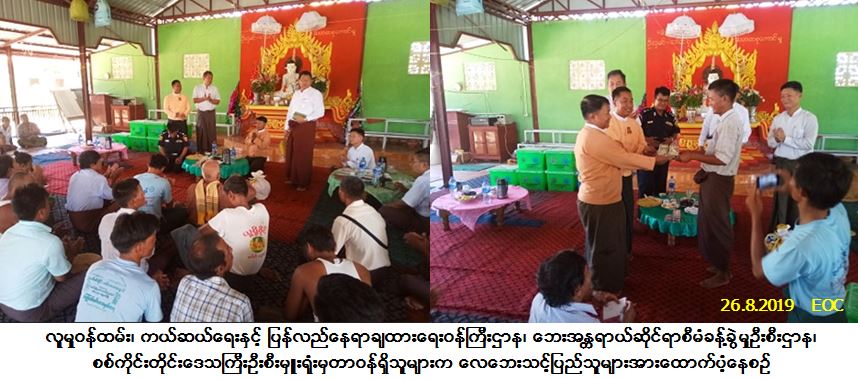 လူမှုဝန်ထမ်း၊ ကယ်ဆယ်ရေးနှင့် ပြန်လည်နေရာချထားရေးဝန်ကြီးဌာန၊ ဘေးအန္တရာယ်ဆိုင်ရာစီမံခန့်ခွဲမှုဦးစီး ဌာန၊ စစ်ကိုင်းတိုင်းဒေသကြီးဦးစီးမှူးရုံးမှတာဝန်ရှိသူများသည် ရွှေဘိုခရိုင်၊ ဝက်လက်မြို့နယ်၊ ရွှေပန်းကုန်းကျေးရွာအုပ်စု၊ အင်းမတောကျေးရွာ၌ (၂၅-၈-၂၀၁၉) ရက်နေ့တွင် ဖြစ်ပွားခဲ့သော လေပြင်းတိုက်ခတ်မှုကြောင့် ပြိုကျနေအိမ်(၁၅)လုံးအတွက် အိမ်ဆောက်ပစ္စည်းဖိုးထောက်ပံ့ငွေ (၁,၅၀၀,၀၀၀/-) ကျပ်၊ ကယ်ဆယ်ရေးပစ္စည်း(၁၀)မျိုး(၁၅)အိမ်ထောင်စုစာ၊ အမိုးလန်နေအိမ်(၄၉)လုံးအတွက် အိမ်ဆောက် ပစ္စည်းဖိုးထောက်ပံ့ငွေ (၁,၁၈၀,၀၀၀/-) ကျပ်၊ ဘေးသင့်အိမ်ထောင်စု(၆၄)စုမှ လူဦးရေ (၂၇၈)ဦး အတွက် ဆန်ရိက္ခာဖိုးထောက်ပံ့ငွေ (၅၈၃,၈၀၀/-) ကျပ်တို့ကို (၂၆-၈-၂၀၁၉) ရက်နေ့တွင် စစ်ကိုင်းတိုင်း ဒေသကြီးအစိုးရအဖွဲ့မှလူမှုရေးဝန်ကြီးနှင့်အတူ ဘေးသင့်ပြည်သူများထံသို့ သွားရောက်ထောက်ပံ့ ပေးအပ်ခဲ့ပါကြောင်း သတင်းရရှိပါသည်။