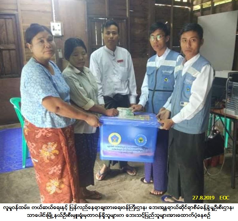 လူမှုဝန်ထမ်း၊ ကယ်ဆယ်ရေးနှင့် ပြန်လည်နေရာချထားရေးဝန်ကြီးဌာန၊ ဘေးအန္တရာယ်ဆိုင်ရာစီမံခန့်ခွဲမှုဦးစီး ဌာန၊ သာပေါင်းမြို့နယ်ဦးစီးမှူးရုံးမှတာဝန်ရှိသူများသည် သာပေါင်းမြို့နယ်၊ ဒည်ကုန်းကျေးရွာအုပ်စု၊ သစ်စိမ့် ကုန်းကျေးရွာ၌ (၂၃-၈-၂၀၁၉) ရက်နေ့တွင် ဖြစ်ပွားခဲ့သောလေဘေးကြောင့် ပြိုကျပျက်စီးနေအိမ်(၁)လုံးအတွက် အိမ်ဆောက်ပစ္စည်းဖိုးထောက်ပံ့ငွေ (၁၀၀,၀၀၀/-) ကျပ်၊ ဘေးသင့်လူဦးရေ (၇) ဦးအတွက် ဆန်ရိက္ခာ(၇)ရက်စာဖိုးထောက်ပံ့ငွေ (၁၄,၇၀၀/-) ကျပ်နှင့် ကယ်ဆယ်ရေးပစ္စည်း(၁၆)မျိုး (၁) အိမ်ထာင်စုစာ တို့ကို (၂၇-၈-၂၀၁၉) ရက်နေ့၊ (၁၀း၄၅) အချိန်တွင် ဘေးသင့်ပြည်သူများလက်ဝယ်သို့ ထောက်ပံ့ပေးအပ်ခဲ့ပါကြောင်း သတင်းရရှိပါသည်။