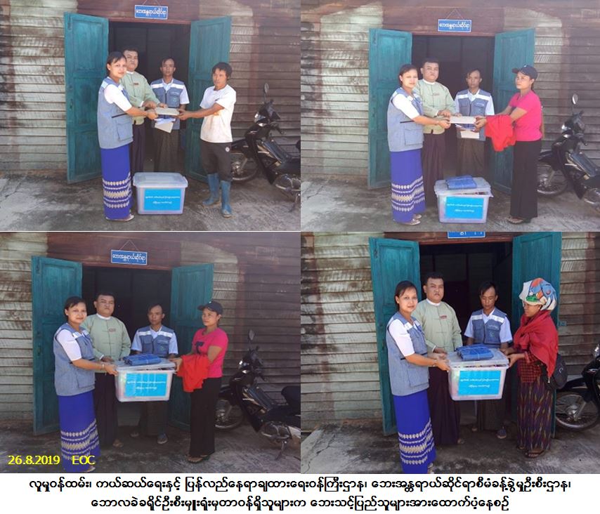 လူမှုဝန်ထမ်း၊ ကယ်ဆယ်ရေးနှင့် ပြန်လည်နေရာချထားရေးဝန်ကြီးဌာန၊ ဘေးအန္တရာယ်ဆိုင်ရာစီမံခန့်ခွဲမှုဦးစီး ဌာန၊ ဘောလခဲခရိုင်ဦးစီးမှူးရုံးမှတာဝန်ရှိသူများသည် ကယားပြည်နယ်၊ ဘောလခဲခရိုင်၊ ဖားဆောင်းမြို့နယ်၊ မော်ချီးကျေးရွာအုပ်စု၊ မော်ချီးတောင်ပေါ်နှင့်တောင်အောက်ကျေးရွာတို့၌ (၂၄-၈-၂၀၁၉) ရက်နေ့တွင် ဖြစ်ပွားခဲ့သော မိုးသည်းထန်စွာရွာသွန်း၍ မြေပြိုမှုကြောင့် ပျက်စီးဘာသာရေးအဆောက်အဦ (၁)လုံးအတွက် ထောက်ပံ့ငွေ (၂၀၀,၀၀၀/-)ကျပ်၊ ပျက်စီးနေအိမ်(၃)လုံးအတွက် အိမ်ဆောက်ပစ္စည်းဖိုးထောက်ပံ့ငွေ (၆၀၀,၀၀၀/-)ကျပ်၊ ကယ်ဆယ်ရေးပစ္စည်း (၂၁)မျိုး (၃)အိမ်ထောင်စုစာ၊ ကြိုတင်ဖျက်သိမ်းပြောင်းရွှေ့နေအိမ်(၁)လုံးအတွက် ကယ်ဆယ်ရေးပစ္စည်း (၁၀)မျိုး (၁)အိမ်ထောင်စုစာနှင့် ဘေးသင့်လူဦးရေ (၂၃)ဦးအတွက် ဆန်ရိက္ခာ(၇)ရက်စာဖိုးထောက်ပံ့ငွေ (၄၈,၃၀၀/-)ကျပ်တို့ကို (၂၆-၈-၂၀၁၉)ရက်နေ့တွင် ထောက်ပံ့ပေးအပ် ခဲ့ပါကြောင်း သတင်းရရှိပါသည်။
