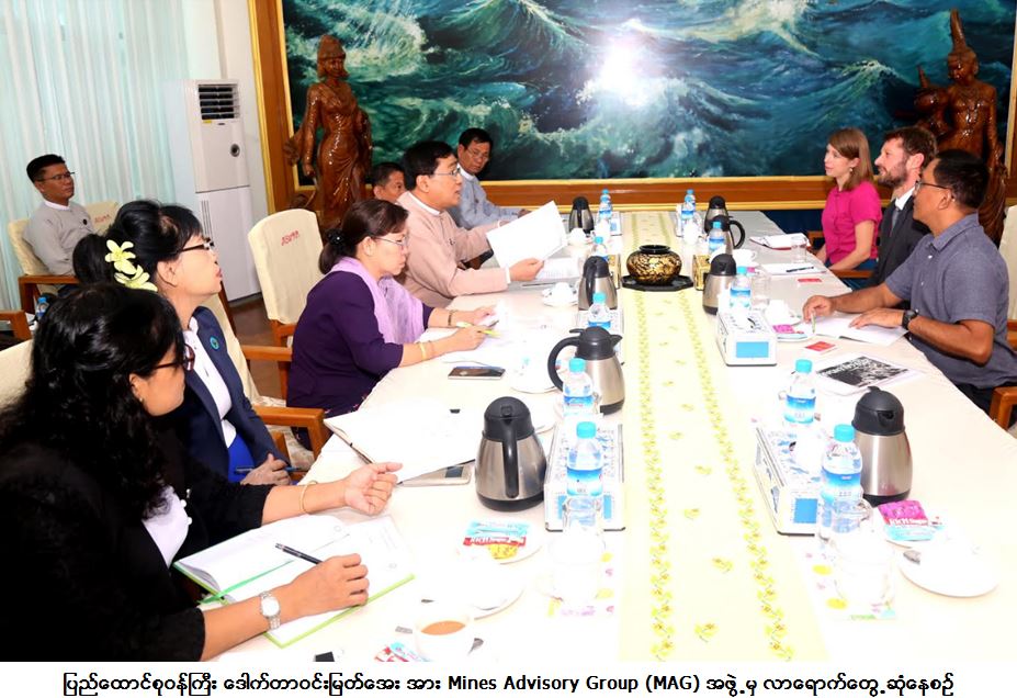 လူမှုဝန်ထမ်း၊ ကယ်ဆယ်ရေးနှင့်ပြန်လည်နေရာချထားရေးဝန်ကြီးဌာန ပြည်ထောင်စုဝန်ကြီး ဒေါက်တာဝင်းမြတ်အေးအား Mines Advisory Group (MAG) အဖွဲ့မှ Country Director ဖြစ်သူ Mr. Bekim Shala ဦးဆောင်သောအဖွဲ့က ယနေ့နံနက်ပိုင်းတွင် အဆိုပါဝန်ကြီးရုံး မေခလာခန်းမ၌ ဂါရဝပြု လာရောက်တွေ့ဆုံခဲ့ပါသည်။
