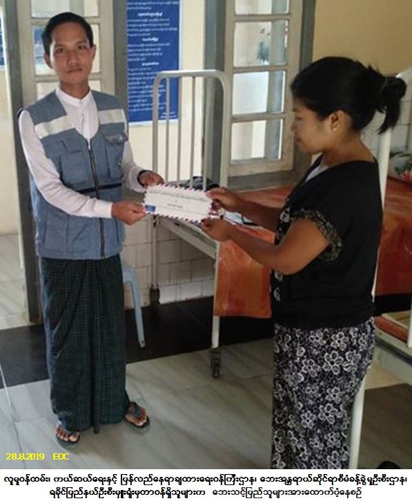 လူမှုဝန်ထမ်း၊ ကယ်ဆယ်ရေးနှင့် ပြန်လည်နေရာချထားရေးဝန်ကြီးဌာန၊ ဘေးအန္တရာယ်ဆိုင်ရာစီမံခန့်ခွဲမှုဦးစီး ဌာန၊ ရခိုင်ပြည်နယ်ဦးစီးမှူးရုံးမှတာဝန်ရှိသူများသည် ရခိုင်ပြည်နယ်၊ မင်းပြားမြို့နယ်၊ ပန်းမြောင်းကျေးရွာအုပ်စု စာသင်ကျောင်းအနီး၌ လက်နက်ကြီးကျရောက်မှုကြောင့် ဒဏ်ရာရရှိသူ(၁)ဦးအတွက် ဒဏ်ရာရထောက်ပံ့ငွေ (၅၀၀၀၀/-) ကျပ်ကို (၂၈-၈-၂၀၁၉) ရက်နေ့တွင် သွားရောက်ထောက်ပံ့ပေးအပ်ခဲ့ပါကြောင်း သတင်း ရရှိပါသည်။