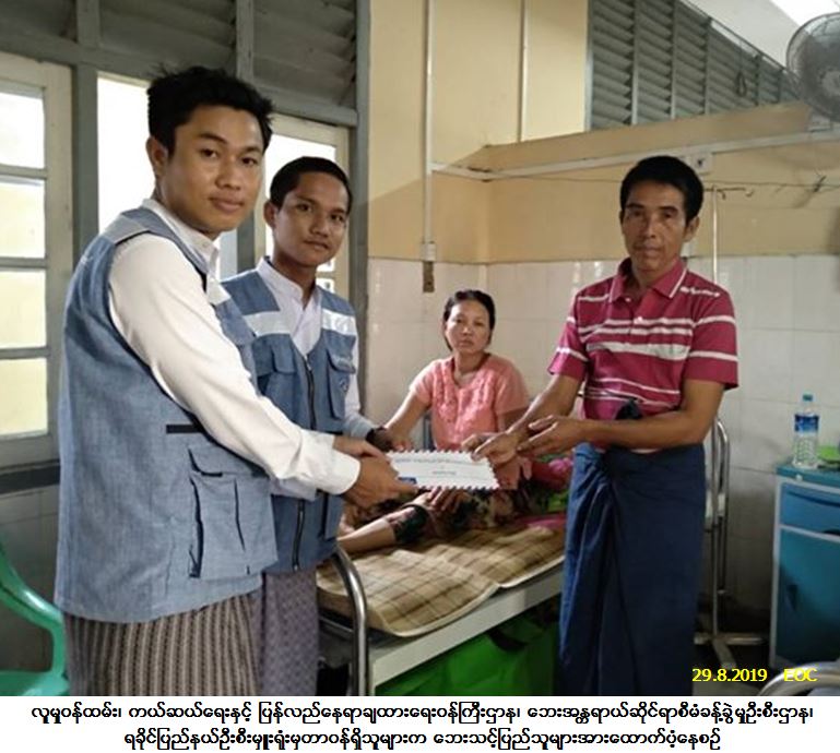 လူမှုဝန်ထမ်း၊ ကယ်ဆယ်ရေးနှင့် ပြန်လည်နေရာချထားရေးဝန်ကြီးဌာန၊ ဘေးအန္တရာယ်ဆိုင်ရာစီမံခန့်ခွဲမှုဦးစီး ဌာန၊ ရခိုင်ပြည်နယ်ဦးစီးမှူးရုံးမှတာဝန်ရှိသူများသည် ရခိုင်ပြည်နယ်၊ ကျောက်တော်မြို့နယ်အတွင်း (၂၈-၈-၂၀၁၉) ရက်နေ့တွင် လက်နက်ငယ်ကျည်ထိမှန်၍ ကျောက်တော်မြို့နယ်၊ ရွှေလှိုင်ကျေးရွာတွင်နေထိုင်သူ (၁)ဦးဒဏ်ရာရရှိခဲ့ရာ အဆိုပါ ဘေးသင့်ပြည်သူအတွက် ဒဏ်ရာရထောက်ပံ့ငွေ (၅၀,၀၀၀/-) ကျပ်ကို (၂၉-၈-၂၀၁၉) ရက်နေ့တွင် ထောက်ပံ့ပေးအပ်ခဲ့ပါကြောင်း သတင်းရရှိပါသည်။