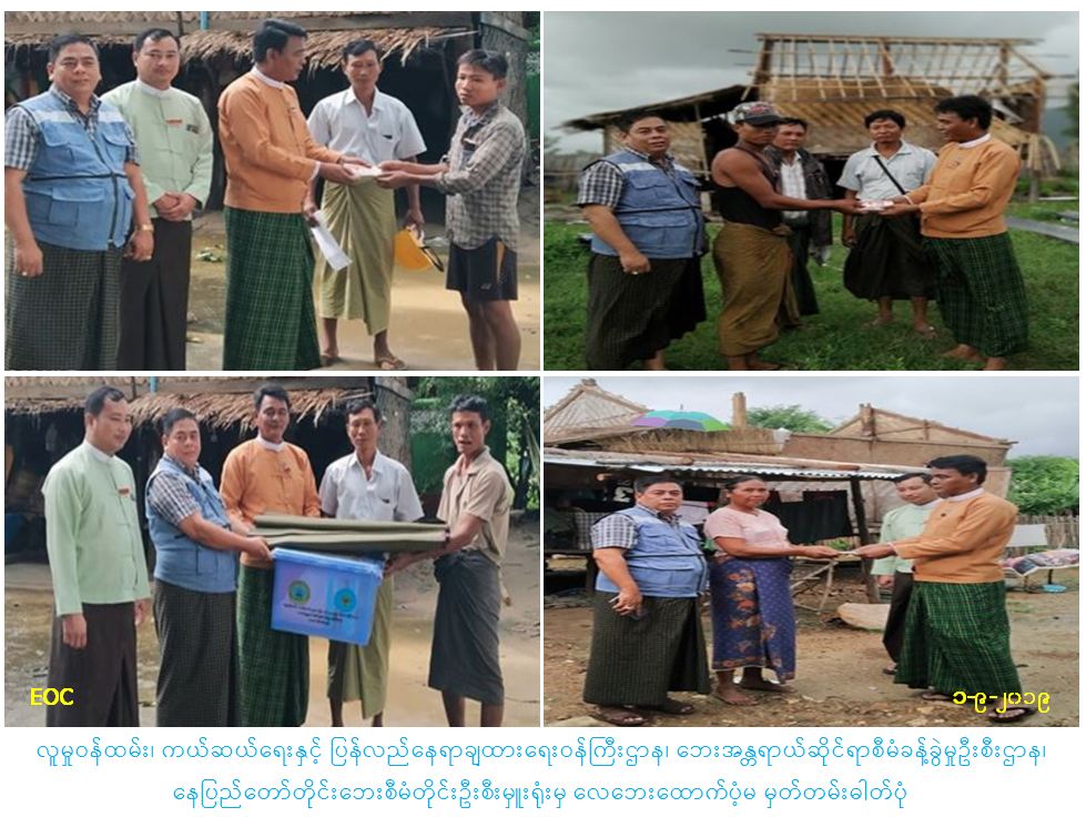 လူမှုဝန်ထမ်း၊ ကယ်ဆယ်ရေးနှင့် ပြန်လည်နေရာချထားရေးဝန်ကြီးဌာန၊ ဘေးအန္တရာယ်ဆိုင်ရာ စီမံခန့်ခွဲမှုဦးစီးဌာန၊ ဒက္ခိဏခရိုင်၊ ပျဉ်းမနားမြို့နယ်အတွင်း (၃၀-၈-၂၀၁၉) ရက်နေ့တွင် ဖြစ်ပွားခဲ့သော ဇီးဖြူပင်ကျေးရွာအုပ်စုမှ ပြိုလဲနေအိမ်(၁)လုံး အမိုးလန်နေအိမ်(၁၂)လုံးအတွက် အိမ်ဆောက် ပစ္စည်းဖိုး ငွေ(၄၂၂၅၀၀/-)နှင့် လူဦးရေ (၆၆)ဦးအတွက် ဆန်ရိက္ခာဖိုးထောက်ပံ့ငွေ (၁၃၈၆၀၀/-)အား လည်းကောင်း ကူးတို့ဆိပ်ကျေးရွာအုပ်စုမှ အမိုးလန်နေအိမ်(၂၂)လုံးအတွက် အိမ်ဆောက်ပစ္စည်းဖိုးငွေ (၅၈၅၀၀၀/-)နှင့် လူဦးရေ(၉၉)ဦးအတွက် ဆန်ရိက္ခာဖိုးထောက်ပံ့ငွေ (၂၀၇၉၀၀/-)အားလည်းကောင်း စုစုပေါင်းထောက်ပံ့ငွေ (၁၃၅၄၀၀၀/-)အား ပြည်သူ့လွှတ်တော်ကိုယ်စားလှယ် ဦးသန်းစိုးအောင် နေပြည်တော်တိုင်းဘေးစီမံတိုင်း ဦးစီးမှူးနှင့်အဖွဲ့ဝင်များ ပျဉ်းမနားမြိုနယ်အုပ်ချုပ်ရေးမှူးနှင့် အဖွဲ့ဝင်များလိုက်ပါ၍ (၃၁.၈.၂၀၁၉)ရက်နေ့ (၁၅:၂၀)အချိန်တွင် ပြည်သူများလက်ဝယ်သို့သွားရောက် ထောက်ပံ့ခဲ့ ပါကြောင်း သတင်းရရှိပါသည်။