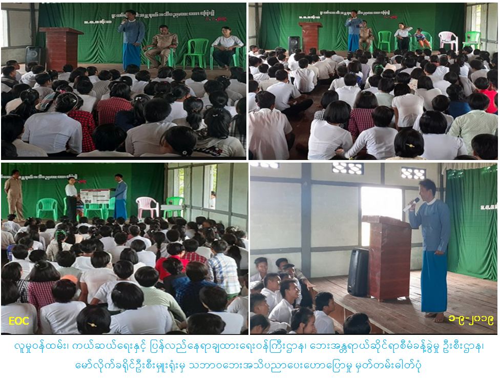 လူမှုဝန်ထမ်း၊ ကယ်ဆယ်ရေးနှင့် ပြန်လည်နေရာချထားရေးဝန်ကြီးဌာန၊ ဘေးအန္တရာယ်ဆိုင်ရာစီမံခန့်ခွဲမှု ဦးစီးဌာန၊ မော်လိုက်ခရိုင်ဦးစီးမှူးရုံးမှ ဝန်ထမ်းများသည် (၃၁-၈-၂၀၁၉)နေ့၊ နေ့လည် (၁၁:၀၀)မှ (၁၂:၃၀)အချိန်ထိ အားကစားနှင့်ကာယပညာဦးစီးဌာနနှင့်ပူးပေါင်း၍ မော်လိုက်မြို့နယ်၊ ပန်းသာကျေးရွာ အထက်တန်းကျောင်းတွင် ကျောင်းသား/သူ စုစုပေါင်း(၁၀၀)ဦးခန့်အား သဘာဝဘေးအန္တရာယ်ဆိုင်ရာ အသိပညာများဟောပြောဆွေးနွေးခဲ့ပြီး လက်ကမ်းစာစောင်နှင့် နံရံကပ်ပိုစတာများ ဖြန့်ဝေပေးခဲ့ပါကြောင်း သတင်းရရှိပါသည်။