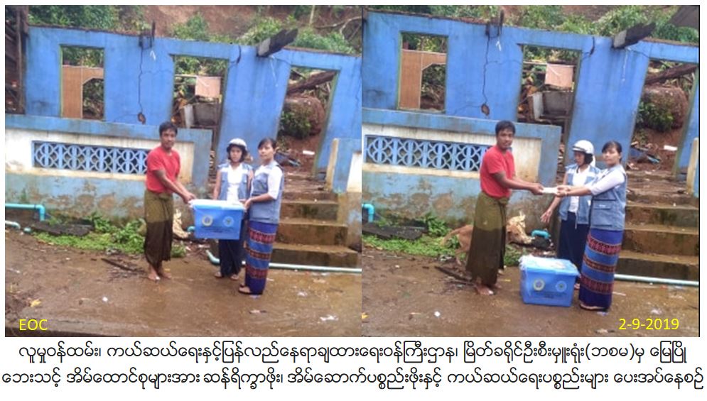 လူမှုဝန်ထမ်း၊ ကယ်ဆယ်ရေးနှင့်ပြန်လည်နေရာချထားရေးဝန်ကြီးဌာန၊ ဘေးအန္တရာယ်ဆိုင်ရာစီမံခန့်ခွဲမှုဦးစီးဌာန၊ မြိတ်ခရိုင်ဦးစီးမှူးရုံးမှ (၃၁.၈.၂၀၁၉)နေ့ ကျွန်းစုမြို့နယ် မအိုင်ကျေးရွာအုပ်စု၊ မစမ်းပါးကျေးရွာမှ မြေပြိုဘေးသင့် တိုက်အိမ်(၁)လုံးအတွက် အိမ်ဆောက်ပစ္စည်းဖိုး (၂)သိန်း ကယ်ဆယိရေးပစ္စည်း(၁၆)မျိုး (၁)စုစာ၊ လူ(၄)ဦးအတွက်ဆန်ဘိုး (၈၄၀၀)ကျပ် တို့အား (၂.၉.၂၀၁၉)နေ့ (၁၂း၁၅)အချိန်တွင် ထောက်ပံ့ပေးခဲ့ကြောင်း သတင်းရရှိပါသည်။