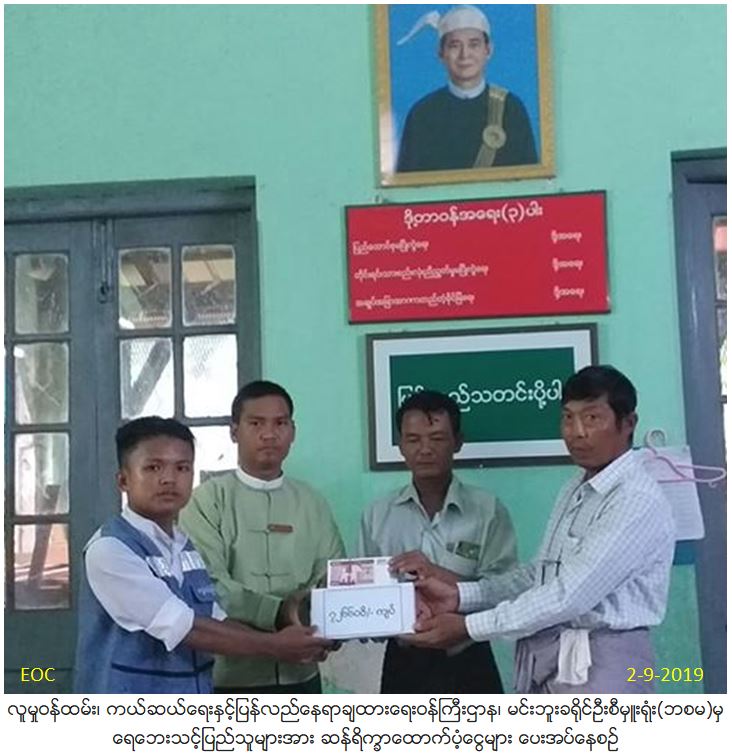 လူမှုဝန်ထမ်း၊ ကယ်ဆယ်ရေးနှင့်ပြန်လည်နေရာချထားရေးဝန်ကြီးဌာန၊ ဘေးအန္တရာယ်ဆိုင်ရာစီမံခန့်ခွဲမှုဦးစီးဌာန၊ မင်းဘူးခရိုင်ဦးစီးမှူးရုံးမှ တာဝန်ရှိသူများသည် စကုမြို့၊ ရပ်ကွက်(၂)ရပ်ကွက်တွင် (၃၁-၈-၂၀၁၉)ရက်နေ့နှင့် (၁-၉-၂၀၁၉)ရက်နေ့တို့၌ ဖြစ်ပွားခဲ့သော စကုမြို့အနီးရှိ လက်တိုချောင်းနှင့် သာမွေးချောင်းတို့ ရေလျှံမှုကြောင့် ပြောင်းရွှေ့အိမ်ခြေ(၈၈)လုံး၊ အိမ်ထောင်စု(၈၈)စုမှ လူဦးရေ(၃၄၆)ဦးအတွက် ဆန်ရိက္ခါ(၇)ရက်စာ (၇၂၆,၆၀၀ိ/-)ကျပ်အား (၂-၉-၂၀၁၉)ရက်နေ့ (၁၅:၀၀)အချိန်တွင် မြို့အုပ်ချုပ်ရေးမှူးနှင့်အတူ ဘေးသင့်ပြည်သူများ လက်ဝယ်အရောက် သွားရောက်ထောက်ပံ့ပေးအပ်ခဲ့ကြောင်း သတင်းရရှိပါသည်။