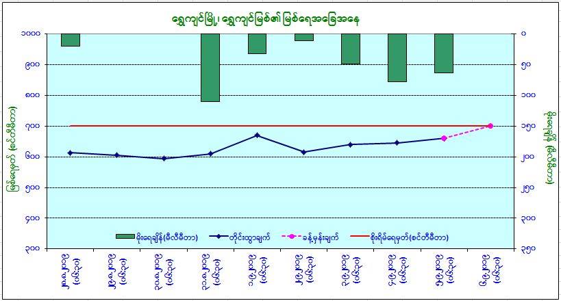 ယနေ့မြန်မာစံတော်ချိန် (၀၉:၃၀)နာရီအချိန် တိုင်းထွာချက်အရ ရွှေကျင်မြစ်ရေသည် ရွှေကျင်မြို့ တွင် ယင်းမြို့၏ စိုးရိမ်ရေမှတ်အောက် (၁)ပေခွဲခန့်တွင် ရောက်ရှိနေပါသည်။ အဆိုပါမြစ်ရေသည် နောက်(၁)ရက်အတွင်း ယင်းမြို့၏ စိုးရိမ်ရေမှတ်သို့ ရောက်ရှိနိုင်ပါသည်။