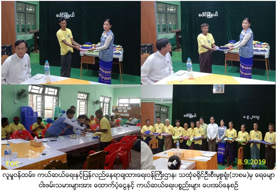 လူမှုဝန်ထမ်း၊ ကယ်ဆယ်ရေးနှင့်ပြန်လည်နေရာချထားရေးဝန်ကြီးဌာန၊ ဘေးအန္တရာယ်ဆိုင်ရာစီမံခန့်ခွဲမှုဦးစီးဌာန၊ သထုံခရိုင်ဦးစီးမှူးရုံးမှ (၁.၉.၂၀၁၉)ရက်နေ့(၂၄း၀၀)နာရီခန့်တွင် ဧရာဝတီတိုင်းဒေသကြီး၊ ဖျာပုံမြို့နယ်၊ ဖုံးတောင်ချောင်းဝ၌ မိုးသက်လေပြင်းတိုက်ခတ်မှုကြောင့် ငါးဖမ်းဖောင်အဖွဲ့ ဖြင့် ပင်လယ်ပြင်တွင် ငါးဖမ်းလုပ်ငန်းလုပ်ကိုင်နေသည့် ငါးဖမ်းသမားများသည် ငါးဖမ်းကျားဖောင်ချုပ်တန်းများ ပြုတ်ထွက်ပျက်စီးခဲ့ပြီး ကျားဖောင်ပေါ်ပါ ငါးဖမ်းအလုပ်သမား (၃၂)ဦးတို့မှာ မွန်ပြည်နယ်၊ ပေါင်မြို့နယ်၊ ညောင်ကုန်းကြီးကျေးရွာ၊ ဝဲပတန်ကျေးရွာ၊ မြလေးချောင်ကျေးရွာနှင့် သဲကုန်းကျေးရွာများသို့ မျောပါဆိုက်ကပ်လာခဲ့ရာ၊ အဆိုပါငါးဖမ်းအလုပ်သမား(၃၂)ဦးတို့အတွက် ခရီးစရိတ်ငွေ(၁)ဦးလျင် (၁၀,၀၀ဝိ/-)နှုန်းဖြင့်(၃၂၀,၀၀ဝိ/-)ကျပ်၊ ကယ်ဆယ်ရေးပစ္စည်း(၄)မျိုးဖြစ်သည့် ကျားလုံချည်၊ တီရှပ်၊ တဘက်၊ ဆပ်ပြာ (၃၂)ဦးတို့အတွက်၊ (၁)ဦးလျင်(တန်ဖိုးငွေ-၇,၉၅ဝိ/-)နှုန်းဖြင့် (စုစုပေါင်းတန်ဖိုးငွေ-၂၅၄,၄၀ဝိ/- )တို့အား (၈.၉.၂၀၁၉)ရက်နေ့တွင် ပေါင်မြို့နယ်၊ အထွေထွေအုပ်ချုပ်ရေးဦးစီးဌာနရုံးခန်းတွင် ထောက်ပံ့ပေးခဲ့ရာ မြို့နယ်သဘာဝဘေးစီမံခန့်ခွဲမှုအဖွဲ့၊ အမျိုးသားလွတ်တော်ကိုယ်စားလှယ် ဦးစိုးသီဟနှင့် ပြည်နယ်လွှတ်တော်ကိုယ်စားလှယ် ဦးဇော်ထူးတို့ တက်ရောက်ခဲ့ကြောင်း သတင်းရရှိပါသည်။