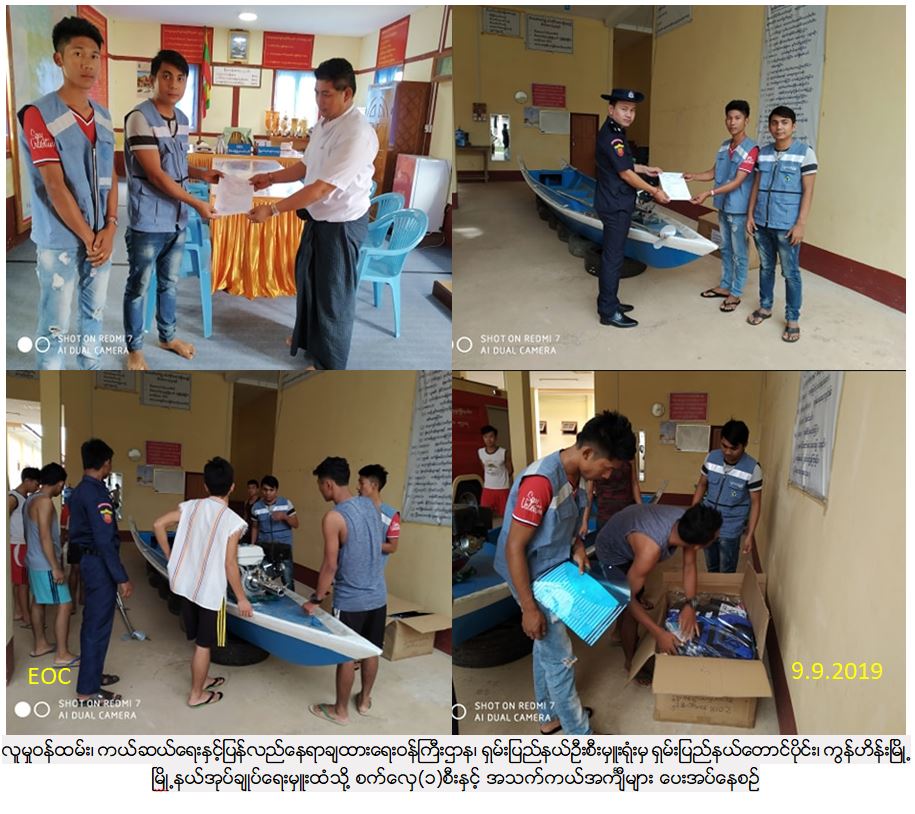 လူမှုဝန်ထမ်း၊ ကယ်ဆယ်ရေးနှင့်ပြန်လည်နေရာချထားရေးဝန်ကြီးဌာန၊ ဘေးအန္တရာယ်ဆိုင်ရာစီမံခန့်ခွဲမှုဦးစီးဌာန၊ ရှမ်းပြည်နယ်ဦးစီးမှူးရုံးမှ (၃ .၉ ၂၀၁၉) ရက်နေ့တွင် ရှမ်းပြည်နယ် တောင်ပိုင်း ကွန်ဟိန်းမြို့ မြို့နယ်အုပ်ချုပ်ရေးမှူ းထံ စက်လှေ (၁)စီး အစုံ နှင့် အသက်ကယ်အကျီ ၤ(၁၀)ထည် ပေးအပ်ခဲ့ကြောင်း သတင်းရရှိပါသည်။