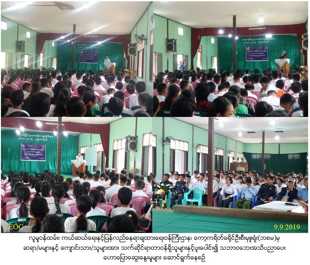 လူမှုဝန်ထမ်း၊ ကယ်ဆယ်ရေးနှင့်ပြန်လည်နေရာချထားရေးဝန်ကြီးဌာန၊ ဘေးအန္တရာယ်ဆိုင်ရာစီမံခန့်ခွဲမှုဦးစီးဌာန၊ ကော့ကရိတ်ခရိုင်ဦးစီးမှူးရုံးမှ (၉.၉.၂၀၁၉)ရက်နေ့တွင် ခရိုင်ပြန်/ဆက်၊ မြို့နယ်မီးသတ်၊ မြို့နယ်စားသုံးသူရေးရာဦးစီးဌာနတို့နှင့်အတူ ကော့ကရိတ်မြို့နယ်၊ အ ထ က(ခွဲ)ဝင်းကြီးကျောင်း၊ဆရာ/ဆရာမ ကျောင်းသူကျောင်းသား(၂၀၀)တို့အား သဘာဝဘေးအန္တရာယ်ဆိုင်ရာ ရေဘေး၊ မုန်တိုင်းဘေး၊ မီးဘေး၊ မြေပြိုဘေး၊ မိုးကြိုးဘေးတို့အားလည်ကောင်း၊ မီးသတ်ဌာနမှ ငလျင်ဘေးဆိုင်ရာ အသိပညာပေးဟောပြောမှုအားလည်းကောင်း၊ ပြန်/ဆက်ဌာနမှ လူကုန်ကူးမှုဆိုင်ရာအသိပညာပေးဟောပြောမှုအားလည်းကောင်း၊ စားသုံးသူရေးရာဌာနမှ အစားအသောက်နှင့်ပတ်သတ်၍ ဆောင်ရန်၊ ရှောင်ရန်အသိပညာပေးဟောပြောမှုများဖြင့်လည်ကောင်း သွားရောက်၍ သဘာဝဘေးန္တရာယ်ဆိုင်ရာအသိပညာပေးလုပ်ငန်းများ ဆောင်ရွက်ခဲ့ကြောင်း သတင်းရရှိပါသည်။