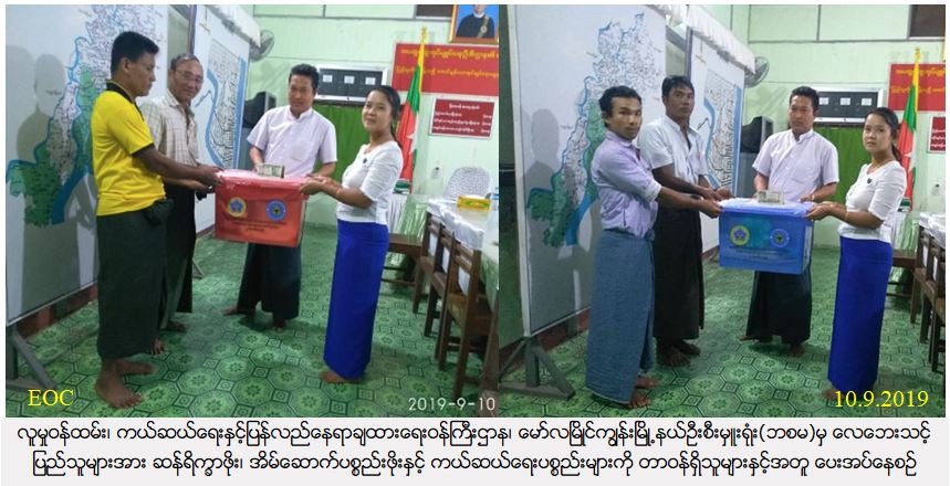 လူမှုဝန်ထမ်း၊ ကယ်ဆယ်ရေးနှင့်ပြန်လည်နေရာချထားရေးဝန်ကြီးဌာန၊ ဘေးအန္တရာယ်ဆိုင်ရာစီမံခန့်ခွဲမှုဦးစီးဌာန၊ မော်လမြိုင်ကျွန်းမြို့နယ်ဦးစီးမှူးရုံးမှ တာဝန်ရှိသူများသည် လပွတ္တာခရိုင်၊ မော်လမြိုင်ကျွန်းမြို့နယ်၊ ကျိုက်ပိကျေးရွာအုပ်စု၊ ကျိုက်ပိကျေးရွာနှင့် ကျွန်းကလေးကျေးရွာအုပ်စု၊ ကျွန်းကြားကြီးကျေးရွာတို့၌ (၆-၉-၂၀၁၉)ရက်နေ့တွင် ဖြစ်ပွားခဲ့သော လေပြင်းတိုက်ခတ်မှုကြောင့် ပြိုကျပျက်စီးခဲ့သည့် နေအိမ် (၂)လုံး၊ တစ်စိတ်တစ်ပိုင်းပြိုကျပျက်စီးခဲ့သော နေအိမ် (၁)လုံး၊ အိမ်ထောင်စု (၃)စုမှ ဘေးသင့်ပြည်သူ (၁၇)ဦးအတွက် ကယ်ဆယ်ရေးပစ္စည်း (၁၆)မျိုးပါ (၂)ပုံး၊ အိမ်ဆောက်ပစ္စည်းဘိုး (၂၅၀၀၀ဝိ/-)၊ ဆန်ရိက္ခာ(၇)ရက်စာ(၃၅၇၀ဝိ/-)၊ စုစုပေါင်း (၂၈၅၇၀ဝိ/-)အား မြို့နယ်အထွေထွေအုပ်ချုပ်ရေးဦးစီးဌာန၌ (၁၀-၉-၂၀၁၉)ရက်နေ့ (၁၂း၀၀)နာရီအချိန်တွင် မြို့နယ်အုပ်ချုပ်ရေးမှူး၊ ကျေးရွာအုပ်ချုပ်ရေးမှူး တို့နှင့်အတူ ဘေးသင့်ပြည်သူများထံ ထောက်ပံ့ပေးခဲ့ကြောင်း သတင်းရရှိပါသည်။
