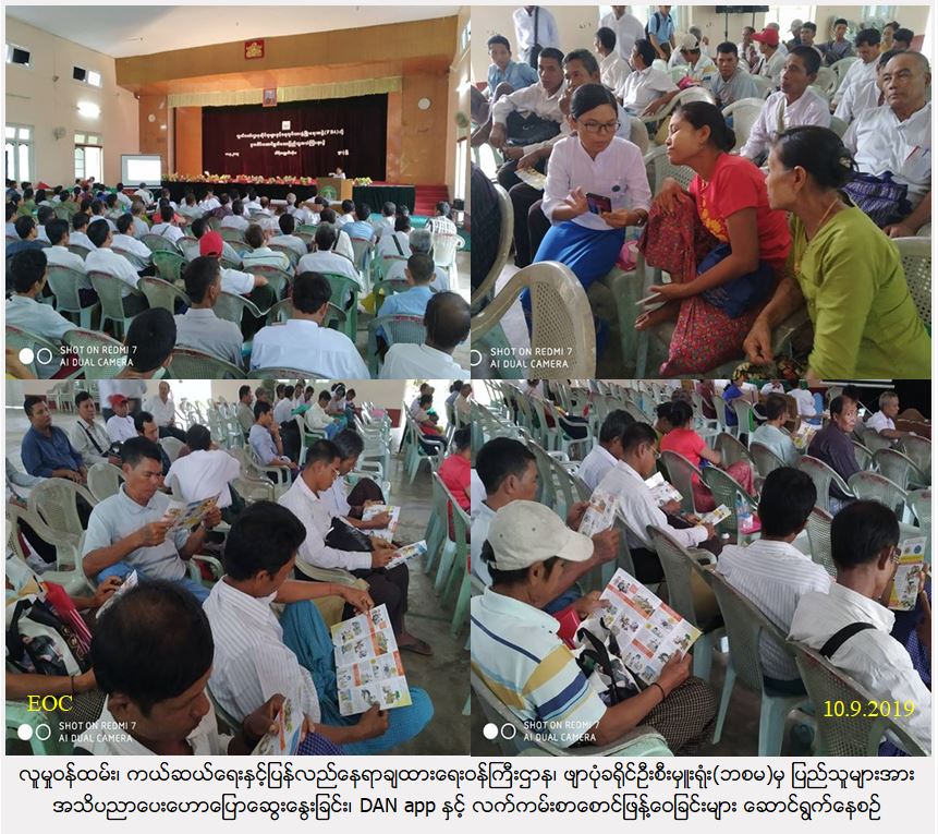 လူမှုဝန်ထမ်း၊ ကယ်ဆယ်ရေးနှင့်ပြန်လည်နေရာချထားရေးဝန်ကြီးဌာန၊ ဘေးအန္တရာယ်ဆိုင်ရာစီမံခန့်ခွဲမှုဦးစီးဌာန၊ ဖျာပုံခရိုင်ဦးစီးမှူးရုံးမှ တာဝန်ရှိသူများသည် (၁၀.၉.၂၀၁၉)ရက်နေ့ ဖျာပုံမြို့၊ သီရိအဏ္ဏဝါခန်းမတွင် ဖျာပုံခရိုင်ဖျာပုံမြို့နယ်၊ ဒေးဒရဲမြို့နယ်အတွင်းရှိ ပြည်သူ(၁၈၀)ဦးအား ဌာနဆိုင်ရာများနှင့်တွေ့ဆုံ၍ ပြည်သူ့အသံကြားနာပွဲကို FDAအဖွဲ့မှကျင်းပခဲ့ရာ ဘေးအန္တရာယ်ဆိုင်ရာစီမံခန့်ခွဲမှုဦးစီးဌာန ရည်ရွယ်ချက်၊ ပြည်သူများအတွက် ဆောင်ရွက်မှုပေးနေသည့် လုပ်ငန်းတာဝန်များ၊ ထောက်ပံ့မှုများ၊ DAN Mobile Application အသုံးပြုပုံများ ရှင်းလင်းပြောကြားခဲ့ပြီး တယ်လီဖုန်းများတွင်ထည့်သွင်းပေးခြင်း၊ လက်ကမ်းစာစောင်များဖြန့်ဝေခြင်း စသည့် အသိပညာပေးလုပ်ငန်းများ ဆောင်ရွက်ခဲ့ကြောင်း သတင်းရရှိပါသည်။
