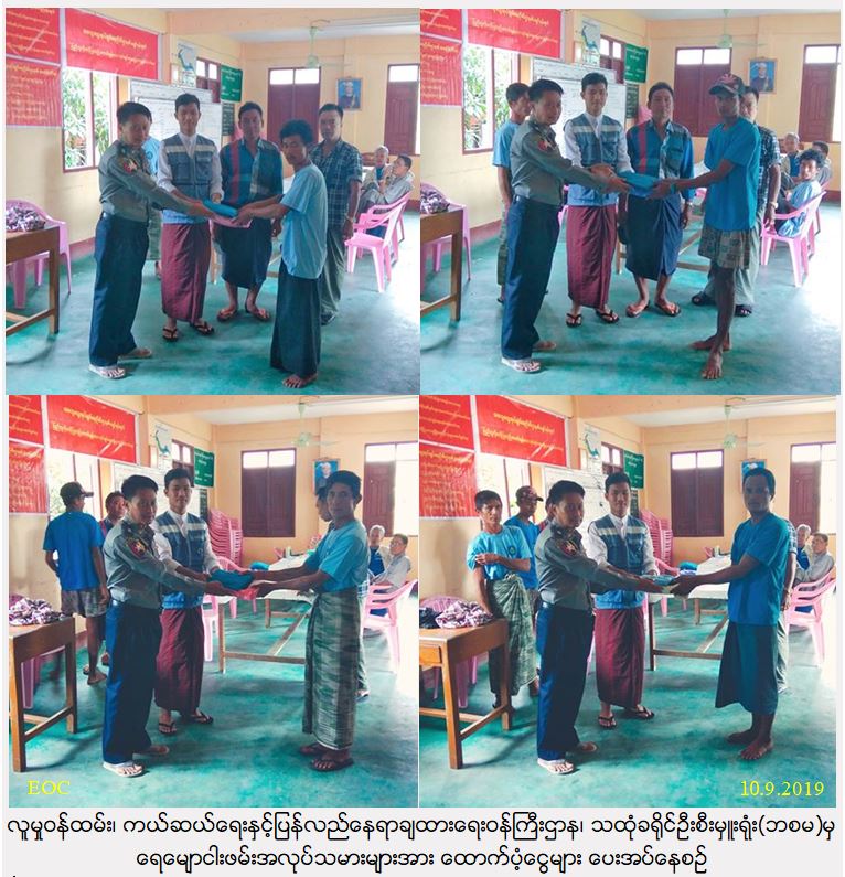 လူမှုဝန်ထမ်း၊ ကယ်ဆယ်ရေးနှင့်ပြန်လည်နေရာချထားရေးဝန်ကြီးဌာန၊ ဘေးအန္တရာယ်ဆိုင်ရာစီမံခန့်ခွဲမှုဦးစီးဌာန၊ သထုံခရိုင်ဦးစီးမှူးရုံးမှ (၃.၉.၂၀၁၉)ရက်နေ့တွင်ဧရာဝတီ တိုင်းဒေသကြီး၊ ဖျာပုံမြို့နယ်၊ ဖုံးတောင်ချောင်းဝ၌ မိုးသက်လေပြင်းတိုက်ခတ်မှုကြောင့် ငါးဖမ်းဖောင်အဖွဲ့ ဖြင့်၎င်းပင်လယ်ပြင်တွင် ငါးဖမ်းလုပ်ငန်းလုပ်ကိုင်နေသည့် ငါးဖမ်းသမားများသည် ကျားဖောင်ကျောက်ကြိုးများ ပြုတ်ထွက်ပျက်စီးခဲ့ပြီး၊ (၉.၉.၂၀၁၉)ရက်နေ့တွင် မွန်ပြည်နယ်၊ ပေါင်မြို့နယ်၊ ထန်းပင်ချောင်ကြီးကျေးရွာချောင်းဝသို့ ထပ်တိုး မျောပါဆိုက်ကပ်လာခဲ့ရာ၊ အဆိုပါထပ်တိုးငါးဖမ်းအလုပ်သမား(၄)ဦးတို့အတွက်ခရီးစရိတ်ငွေ(၁)ဦးလျင် (၁၀,၀၀ဝိ/-)စီဖြင့်(၄၀,၀၀ဝိ/-)အား လည်းကောင်း ကယ်ဆယ်ရေးပစ္စည်း(၄)မျိုးဖြစ်သည့် ကျားလုံချည်၊ တီရှပ်၊ တဘက်၊ ဆပ်ပြာ (၄)ဦးတို့အတွက်၊ (၁)ဦးလျင်(တန်ဖိုးငွေ-၇,၉၅ဝိ/-)စီဖြင့် (စုစုပေါင်းတန်ဖိုးငွေ-၃၁,၈၀ဝိ/- )တို့အားအားလည်းကောင်း (၁၀.၉.၂၀၁၉)ရက်နေ့တွင် ထောက်ပံ့ပေးခဲ့ကြောင်း သတင်းရရှိပါသည်။